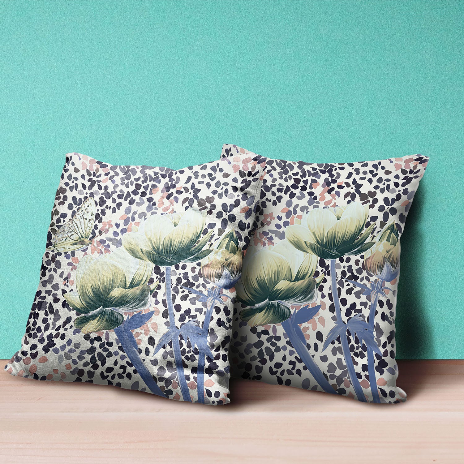 16" x 16" Green and Black Butterfly Blown Seam Floral Indoor Outdoor Throw Pillow