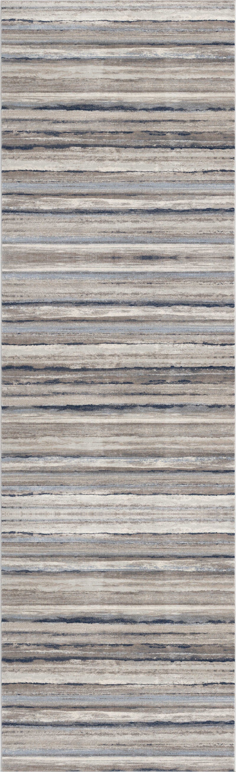 Highlighting each element of contemporary styling to its core, this sophisticated Blue and Beige Distressed Stripes Runner Rug upholds simplicity in the subdued color palette and modern pattern. The distressed blending of blue, gray, and ivory stripes in the contrasting cool tones will add a punch to any room while inducing a refreshing ambiance to your living space. Flaunting the finest craftsmanship of Turkish artisans, this rug is woven in 100% premium polypropylene fibers which is durable and stain-resistant to retain its immaculate look while withstanding the messes and scratches of a busy household. The low pile construction gives a neatly refined look with a smooth surface texture to add a layer of warmth and comfort under your feet. Sleek, stylish, and subtle from every direction, this relaxing runner rug is meant to complete the look of your modern living space. 180” x 27” x 0.4”