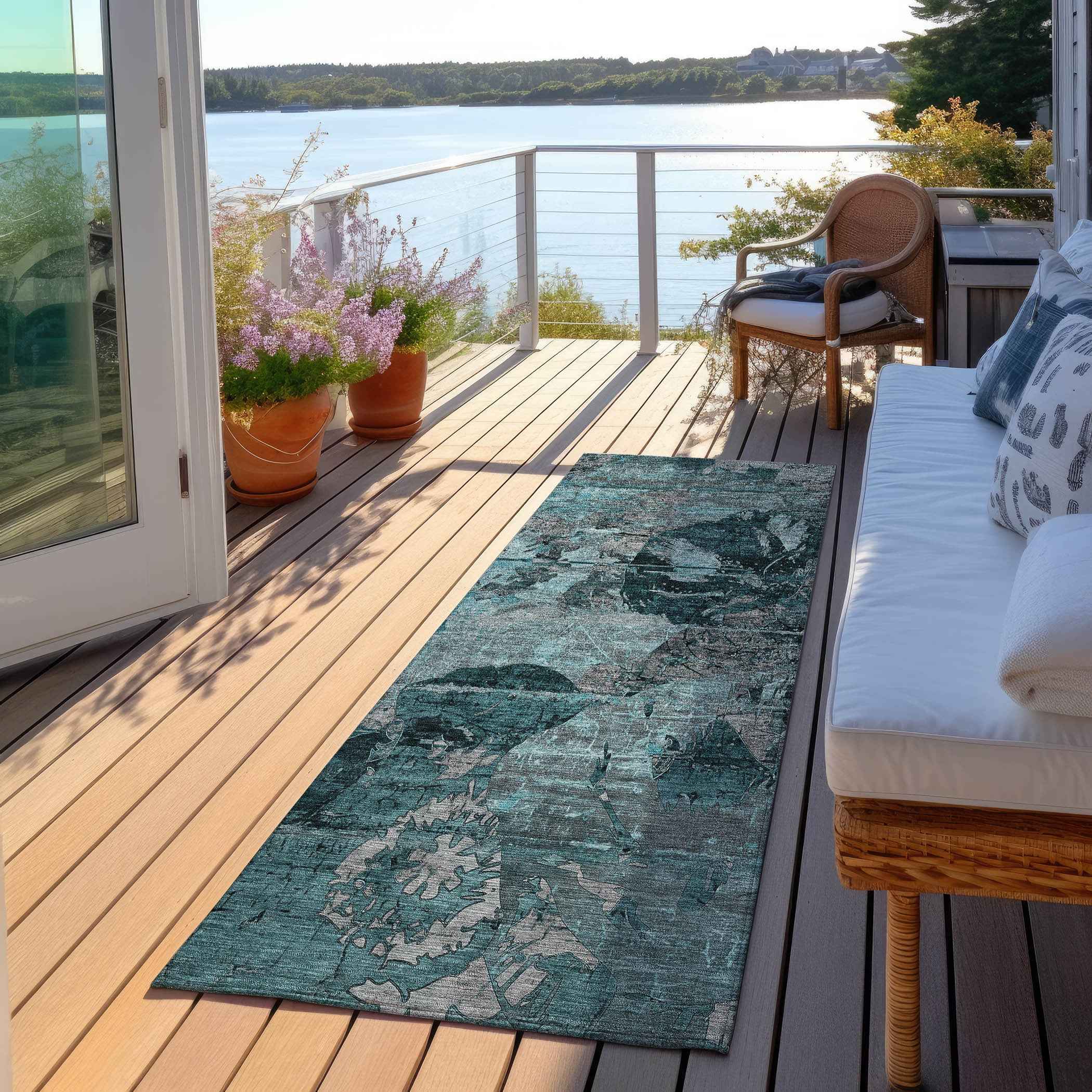 2' X 8' Teal and Gray Abstract Washable Indoor Outdoor Runner Rug