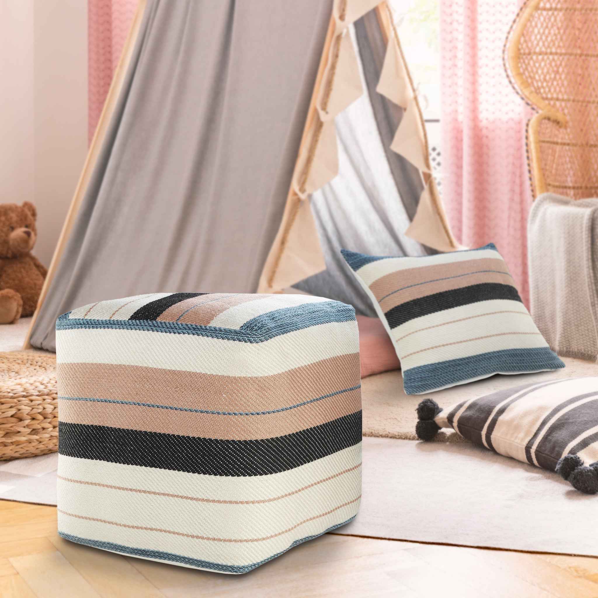Get ready to relax with this 20" white polyester striped indoor outdoor pouf ottoman. Add chic style to your space with this fun pouf that not only looks cool but can be a great footrest or extra seat when needed. Expertly upholstered with padding and soft 100% polyester in a striped pattern, this ottoman is as comfortable as it is good looking. Ottomans are multi-functional additions to your space that add fashion and practical value. 20" H x 20" W x 20" D