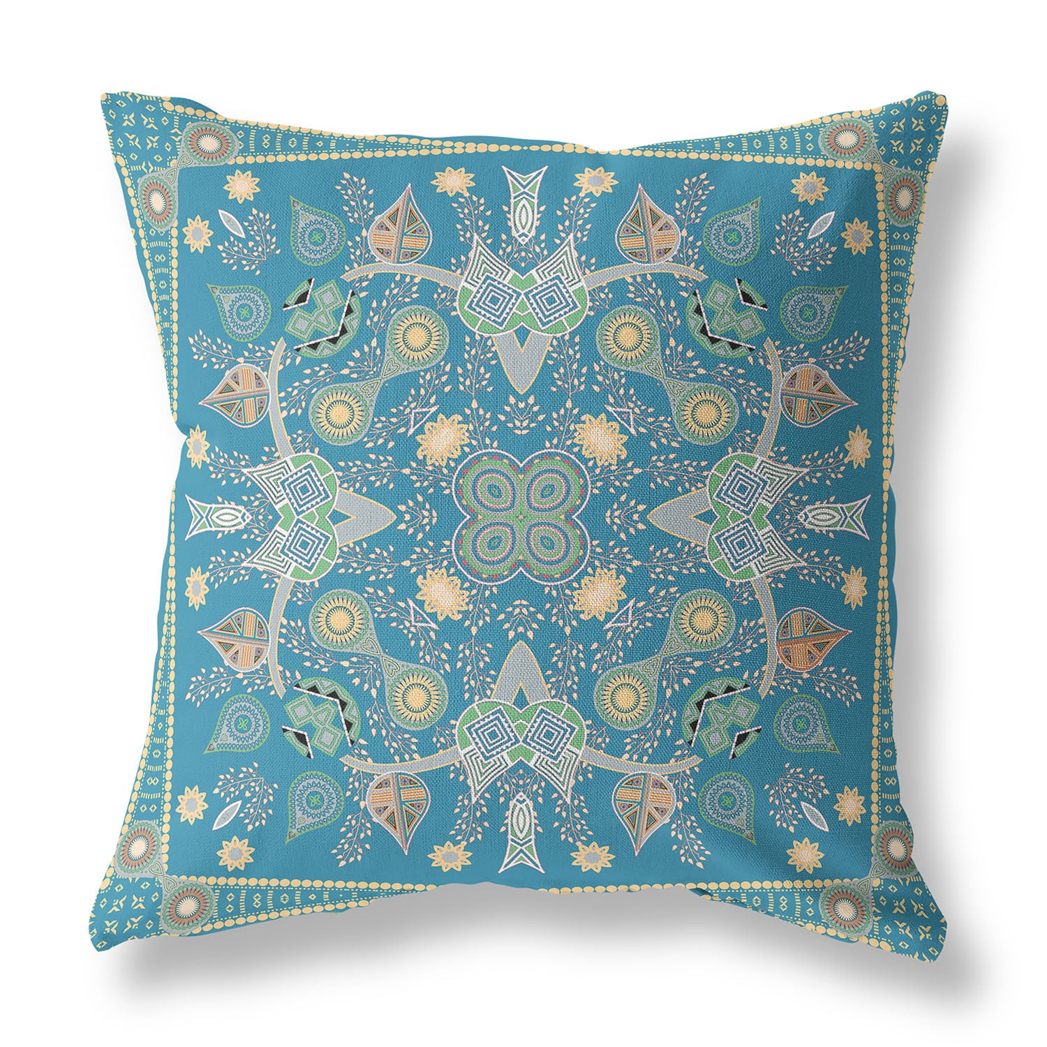 20" X 20" Aqua And Gold Blown Seam Floral Indoor Outdoor Throw Pillow