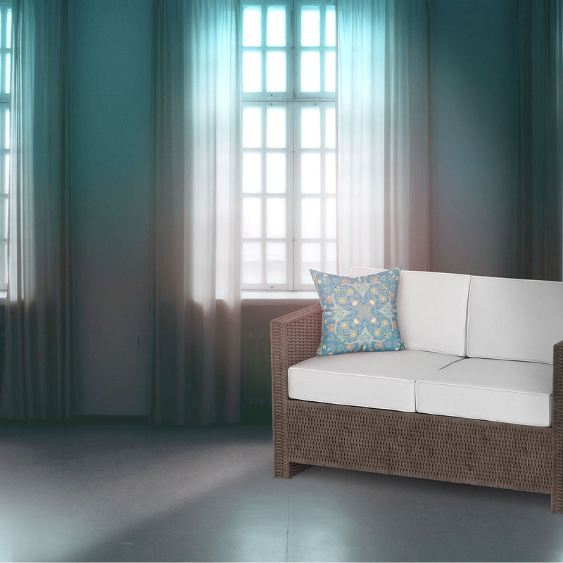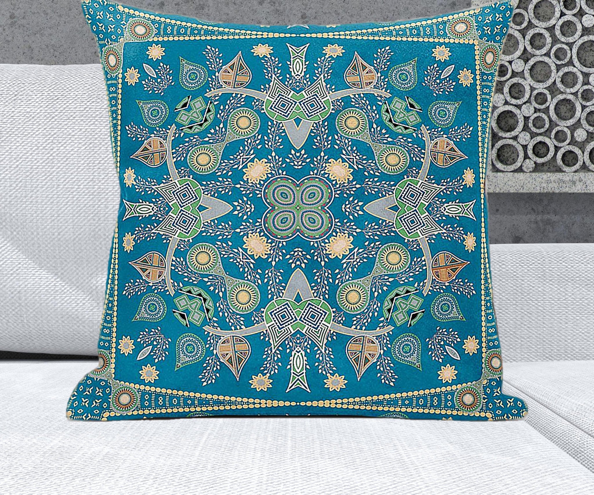 26" X 26" Aqua And Gold Blown Seam Floral Indoor Outdoor Throw Pillow
