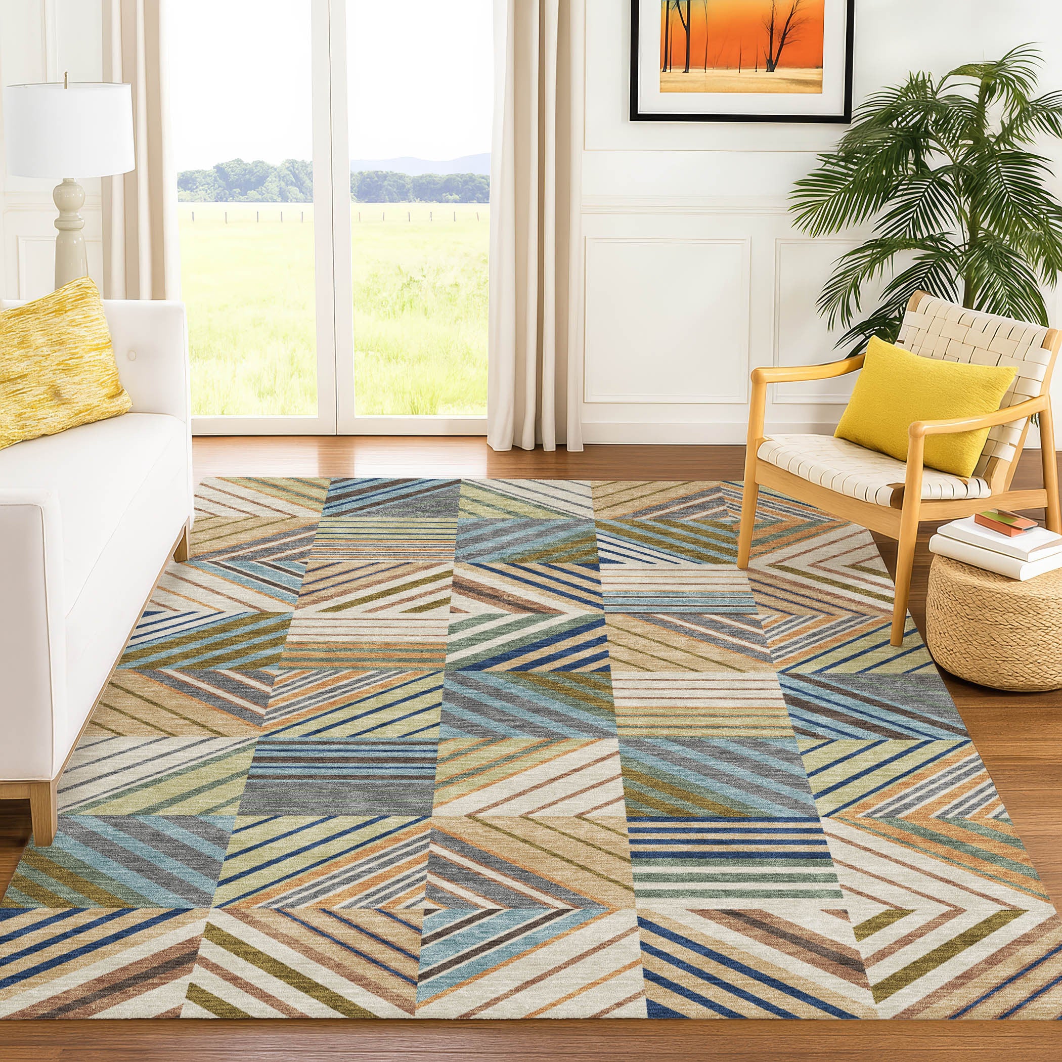 3' X 5' Beige Brown And Blue Patchwork Washable Indoor Outdoor Area Rug