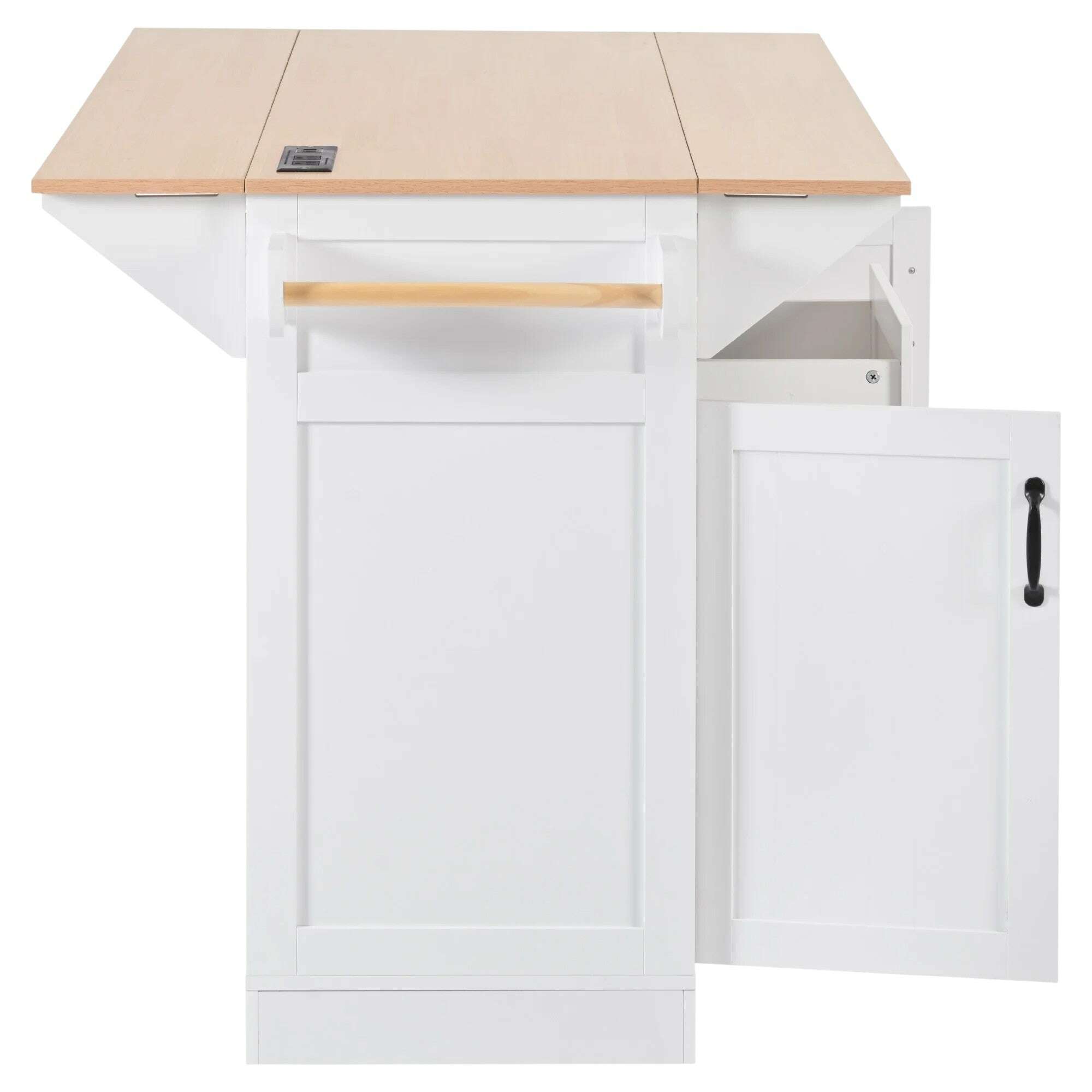 This 56-inch white wood rolling kitchen island with storage marks the beginning of a new era for kitchen decor. Made of a combination of durable solid and manufactured wood this rectangular island is a premium organizing solution that provides extra storage and counter space in your kitchen. The beautiful grains and natural variations of the solid wood give this piece its own unique appearance. Utilize the convenient drawers to store your cooking utensils and accessories. Do you ever find yourself searching for more space when meal prepping. This unit includes a drop leaf, which allows you to expand or scale down your counter space. Enhance the beauty and functionality of your kitchen space with this multi-purpose kitchen island. 36.50-inch h x 55.75-inch w x 34.00-inch d.