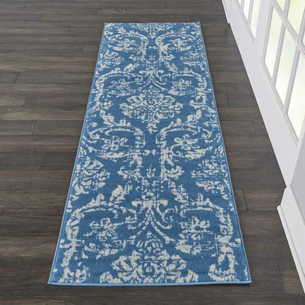 7' Blue Damask Power Loom Runner Rug