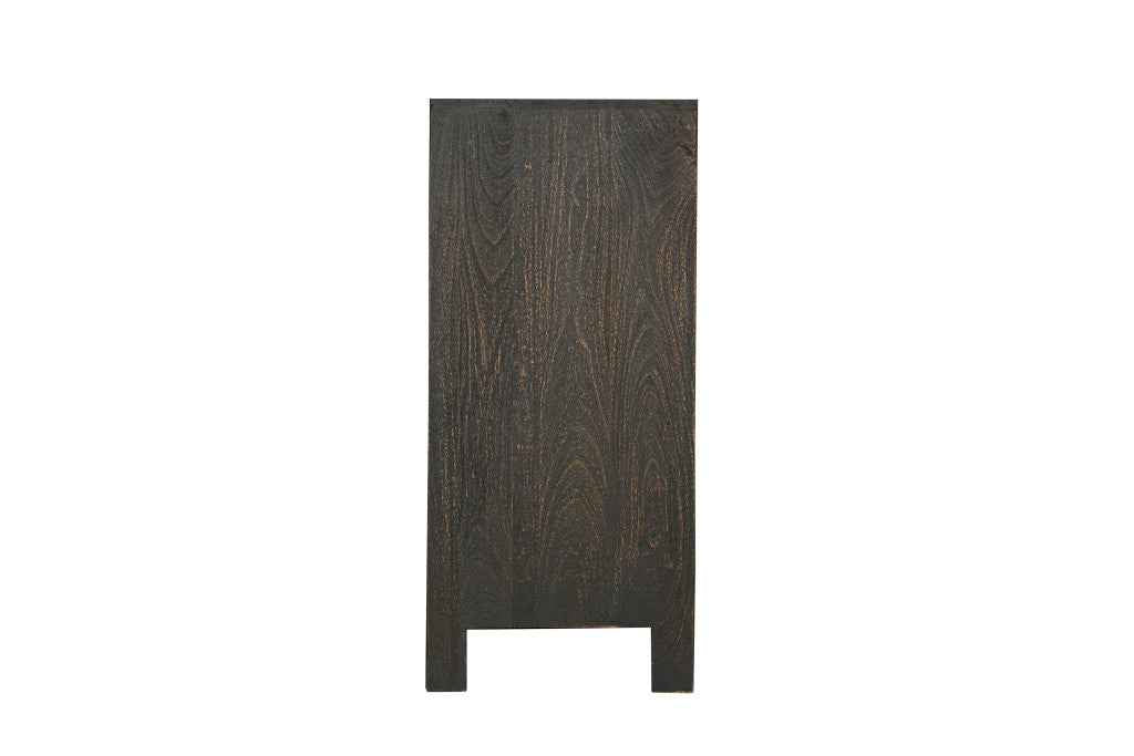 Storage vessels don't have to be unsightly. Increase your storage space and the fashion quotient of your room with this hard wearing, versatile, and good looking cabinet. Crafted from solid mango wood, this sideboard showcases a stunning black finish that effortlessly complements various decor styles. Its beautifully carved floral detailing adds an artistic touch, making it a focal point in any space. Designed with purposeful distressing, each piece boasts unique character and charm. With shelves included for convenient organization, this transitional sideboard is both functional and visually appealing, perfect for enhancing your home interior. 36.00-inch h x 78.00-inch w x 16.00-inch d.