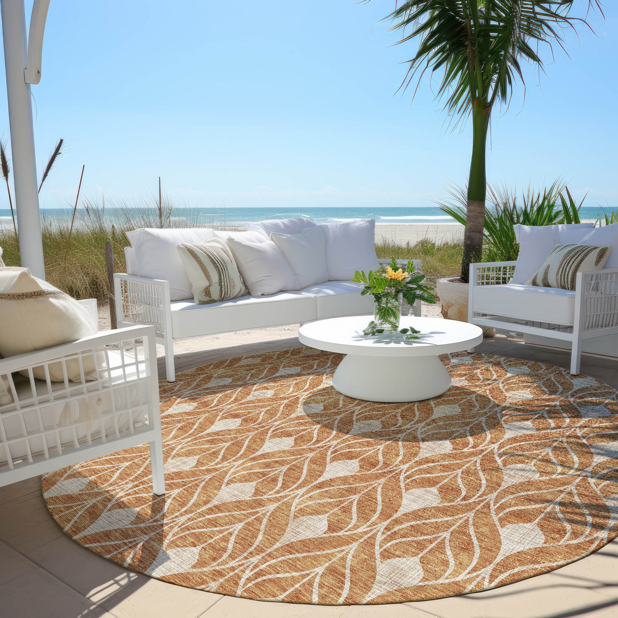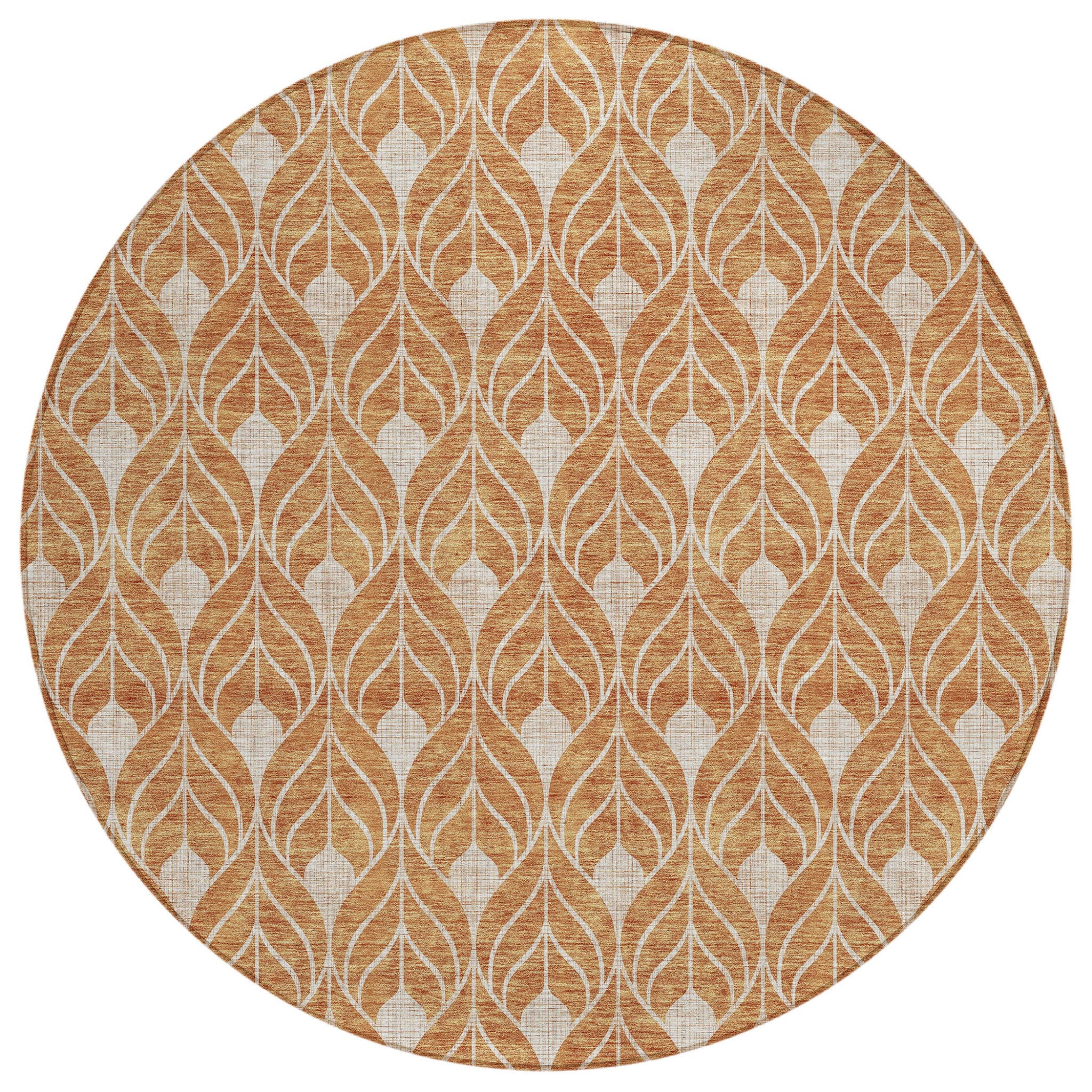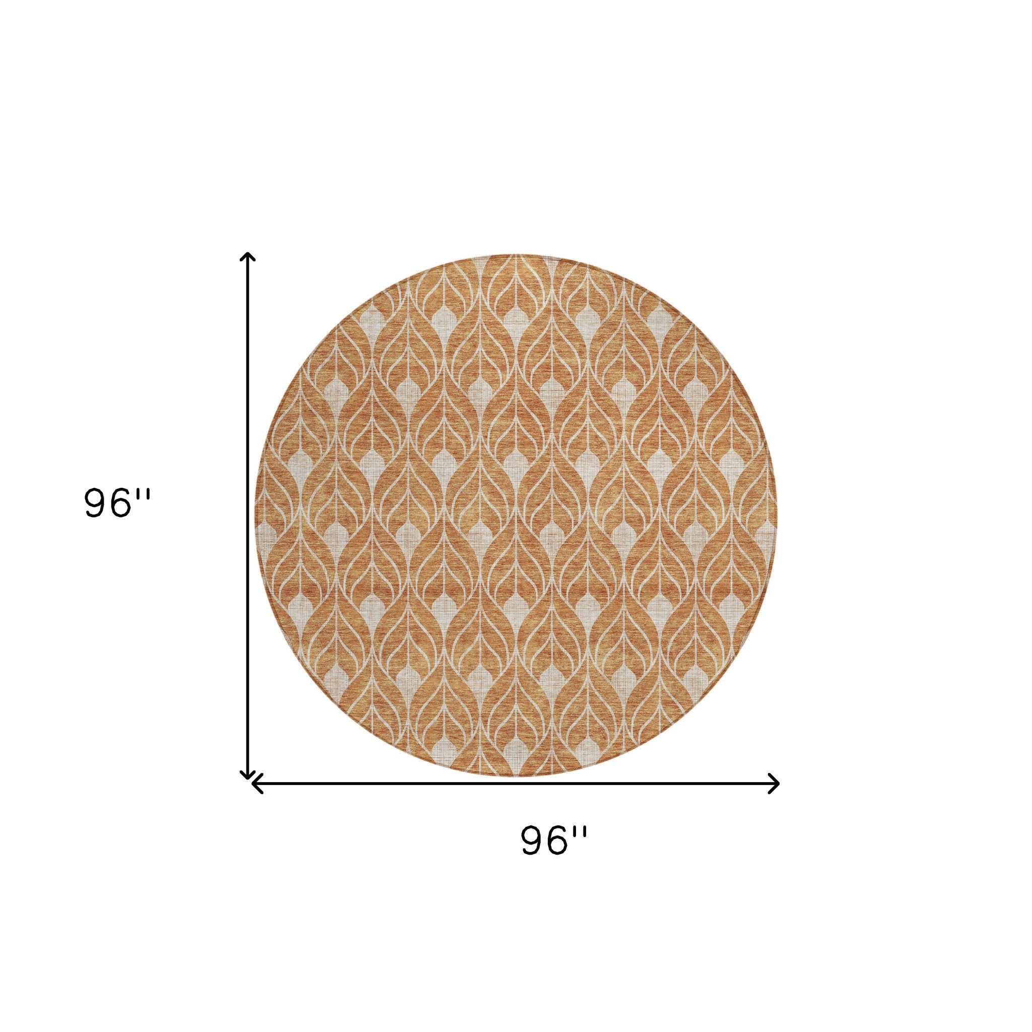 Set an inviting tone in your space with this 8-foot copper and beige round geometric washable indoor outdoor area rug. This geometric round shaped rug features a geometric pattern in copper and beige that combines a good looking print with a unique and updated shape. The mix of shape, color, and design gives this rug refreshing visual interest. Ideal for outdoor spaces or high traffic areas with kids and pets, this rug is made from heavy duty polyester that is stain resistant to help repel water, dirt, and stains. Makes a great way to dress up your patio, porch, or poolside, but also works well as a durable and easy to maintain option in the kitchen, family room, or mudroom. 96-inch h x 96-inch w x 0.19-inch d.