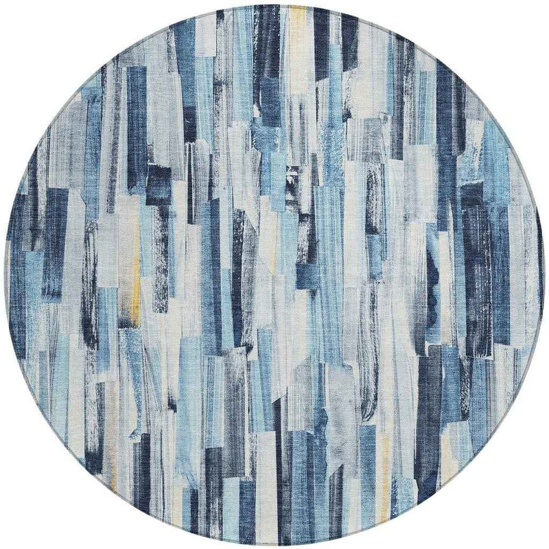 Add some artistry to your room with this 8-foot denim blue and ivory round striped washable indoor outdoor area rug. This geometric round shaped rug features a striped pattern in denim blue and ivory that combines a good looking print with a unique and updated shape. The mix of shape, color, and design gives this rug refreshing visual interest. Ideal for outdoor spaces or high traffic areas with kids and pets, this rug is made from heavy duty polyester that is stain resistant to help repel water, dirt, and stains. Versatile in use, durable, and easy to maintain, this rug is an ideal solution to add a decorative and inviting touch to your indoor or outdoor space. 96-inch h x 96-inch w x 0.19-inch d.