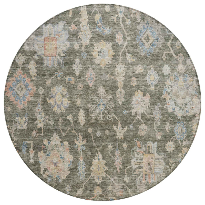 8' Fern Green Beige And Blue Round Floral Washable Indoor Outdoor Area Rug