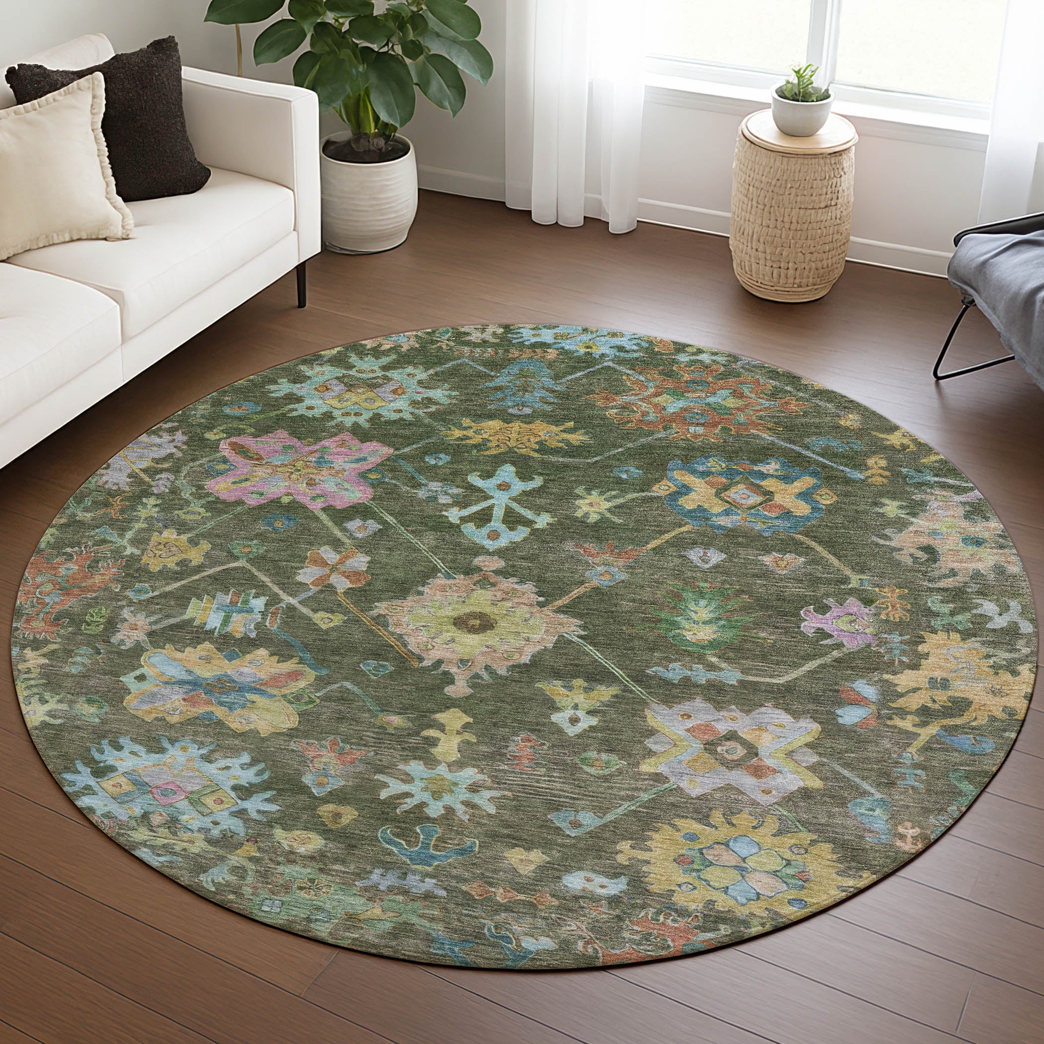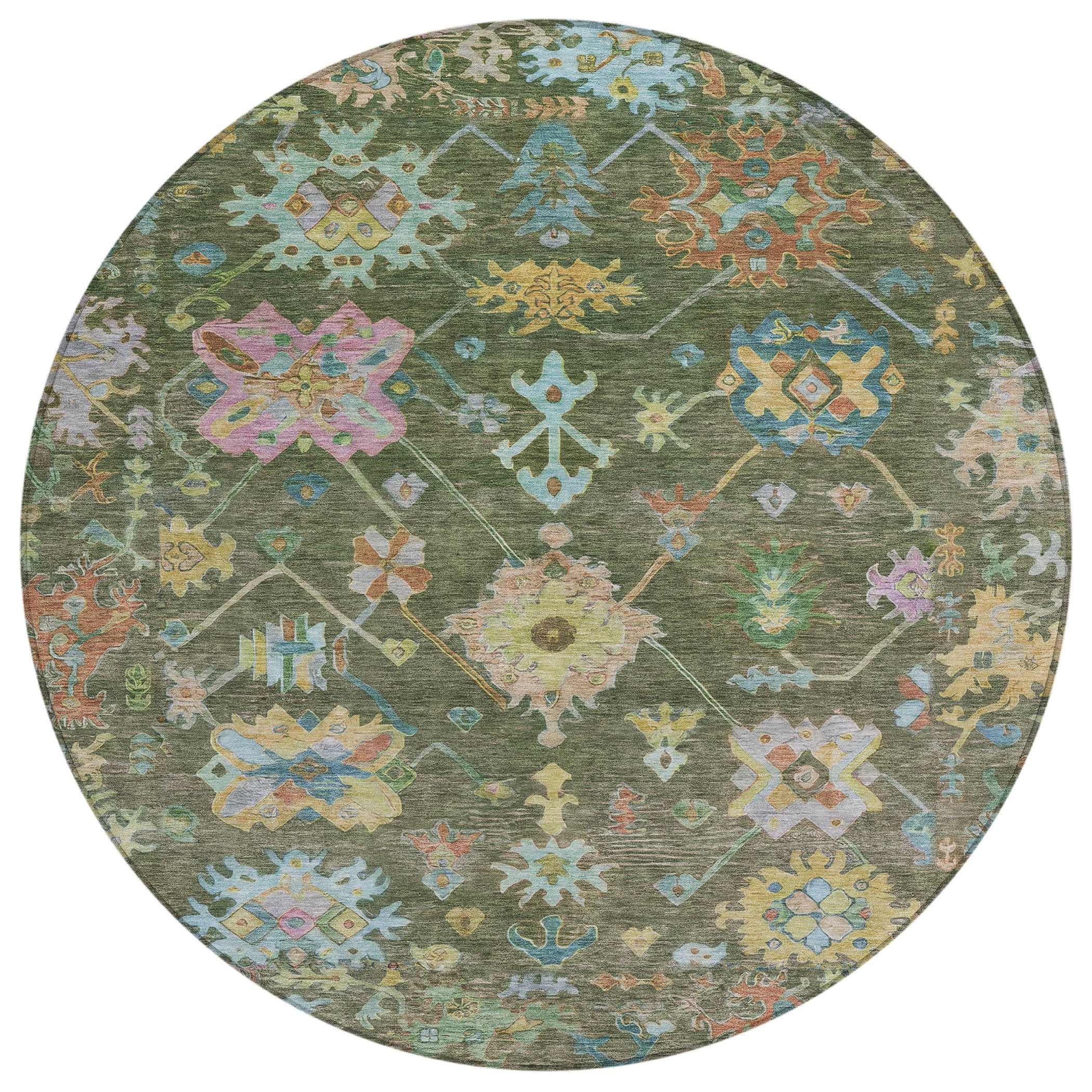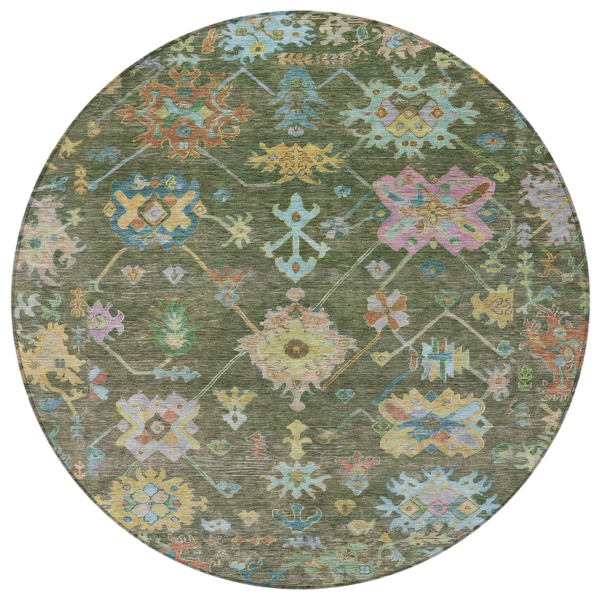 8' Fern Green Pink And Blue Round Floral Washable Indoor Outdoor Area Rug