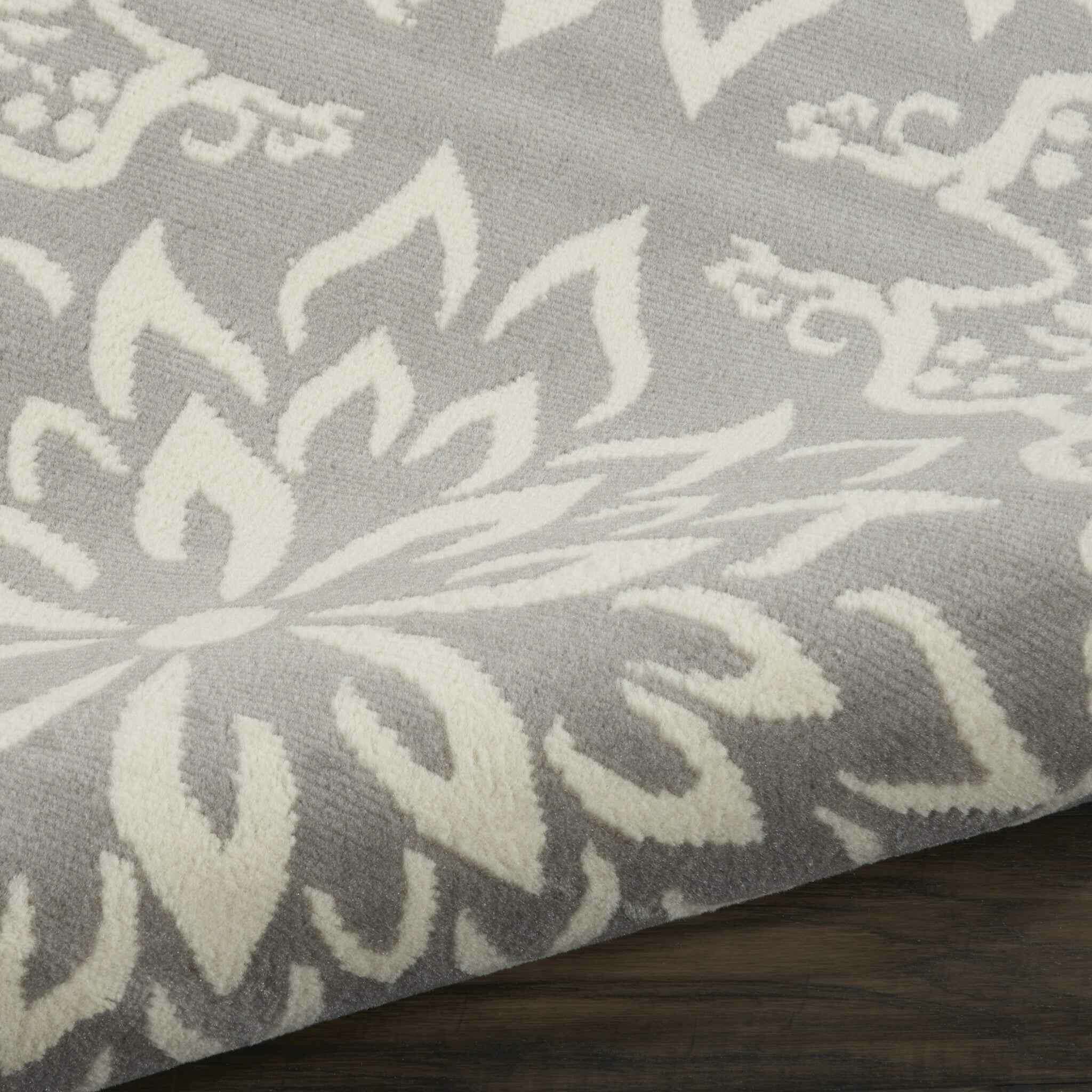 Add great coloration and comfortable texture to your space with this 8' gray round floral power loom area rug. This geometric round shaped rug features a floral pattern in gray that combines a good looking print with a unique and updated shape. The mix of shape, color, and design gives this rug refreshing visual interest. The coloring of this rug adds a delightfully neutral tone to your home and will easily match with most any decor. Made in Turkey, this rug offers high quality combined with good looking designer sensibilities. Area Rugs help to give warmth and sense of home to your space. .50" H x 96" W x 96" D