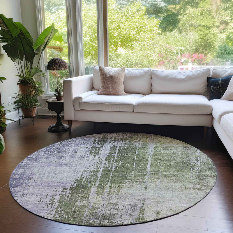 8' Olive Green And Purple Round Abstract Washable Indoor Outdoor Area Rug