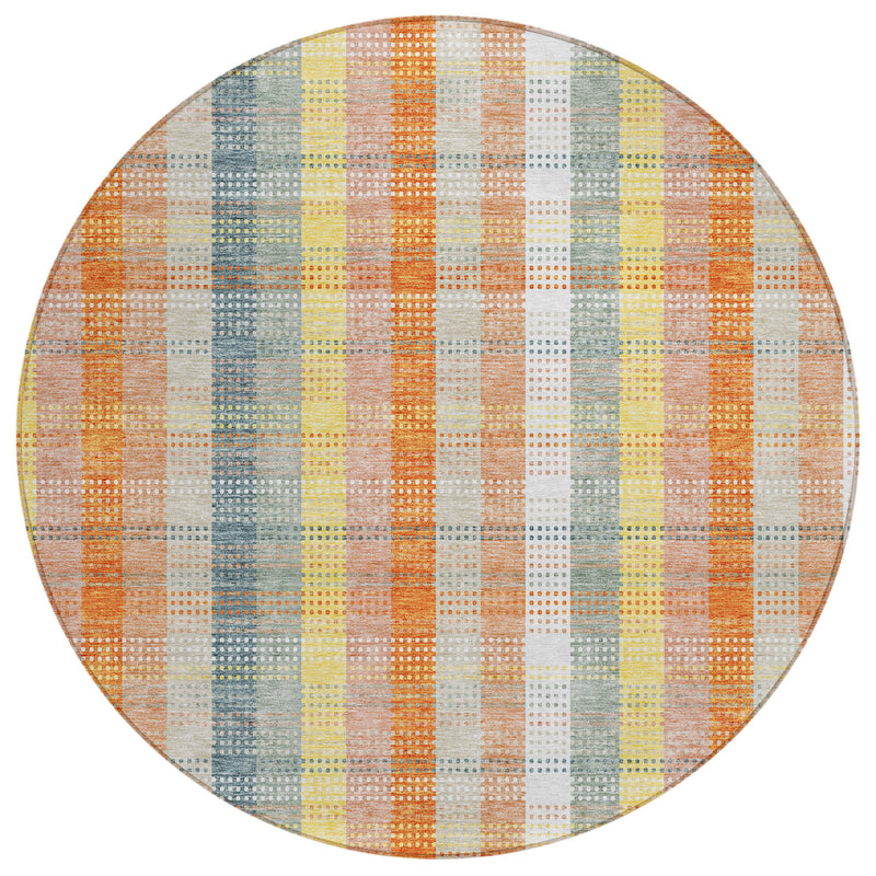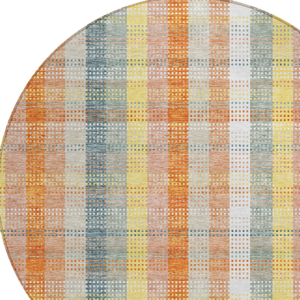 8' Peach Ivory And Orange Round Plaid Washable Indoor Outdoor Area Rug