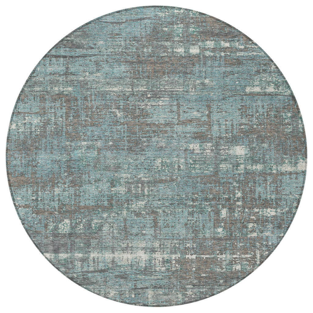 8' Taupe And Teal Blue Round Geometric Washable Indoor Outdoor Area Rug