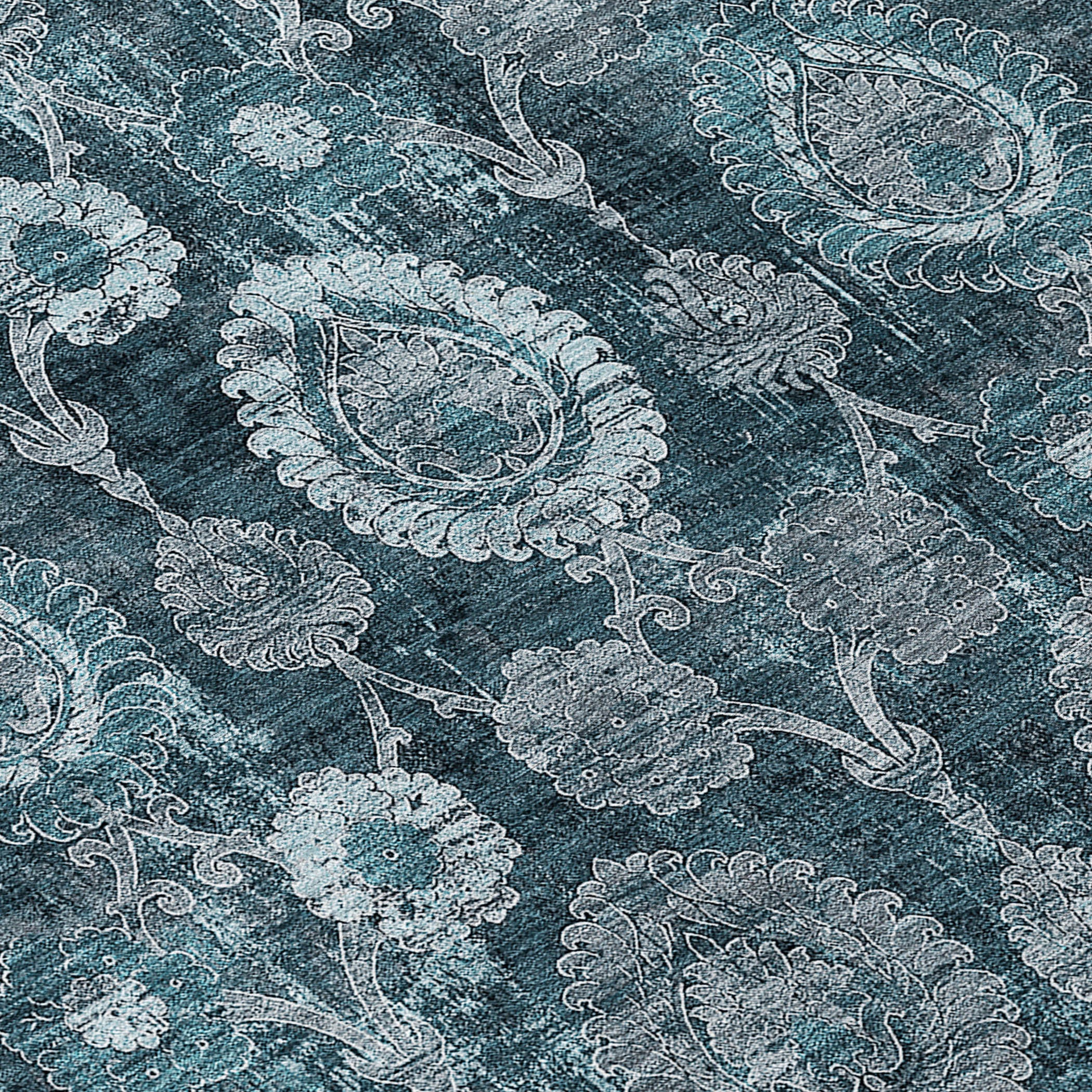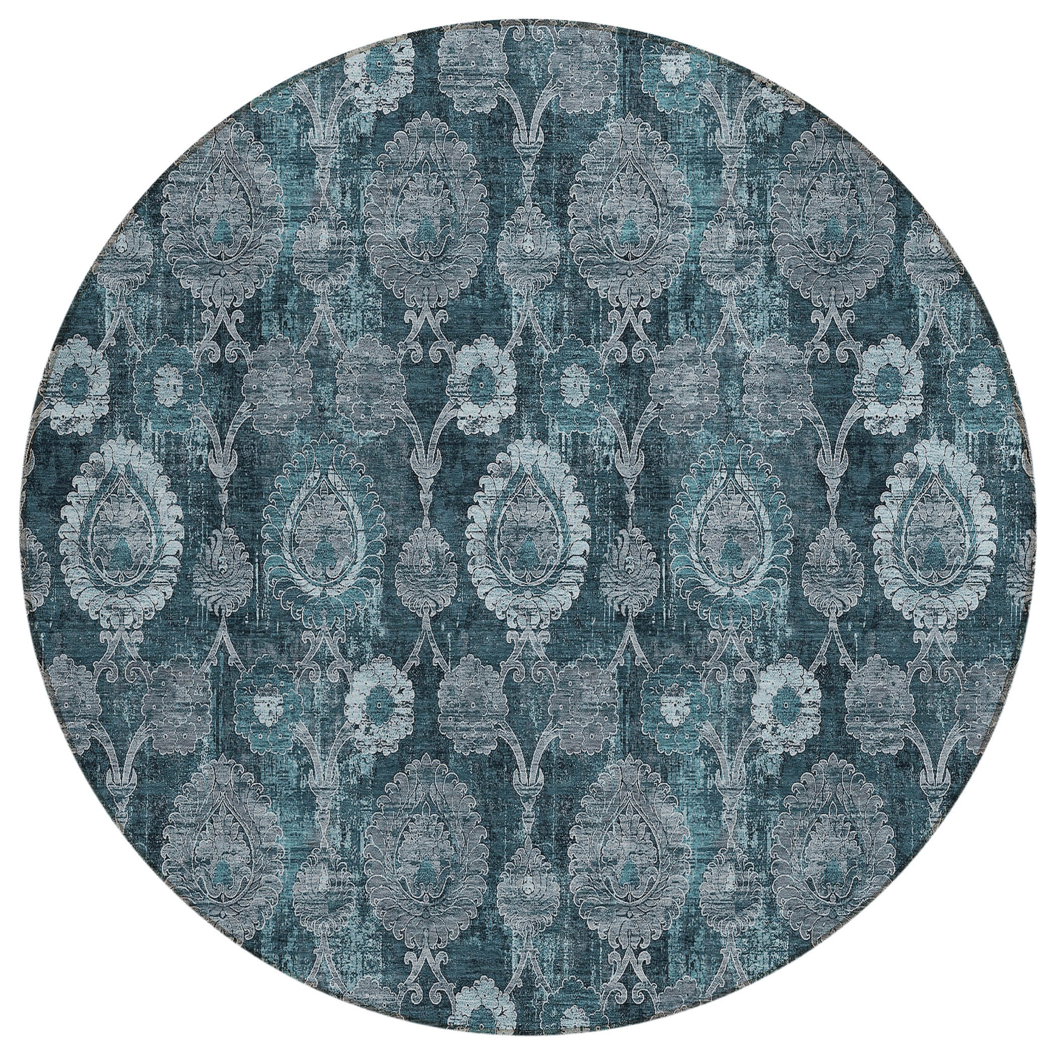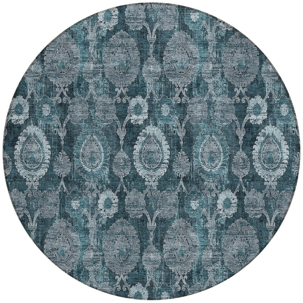 8' Teal Blue And Sky Blue Round Damask Washable Indoor Outdoor Area Rug