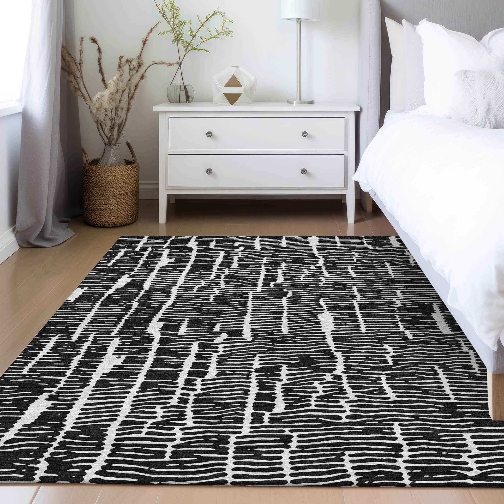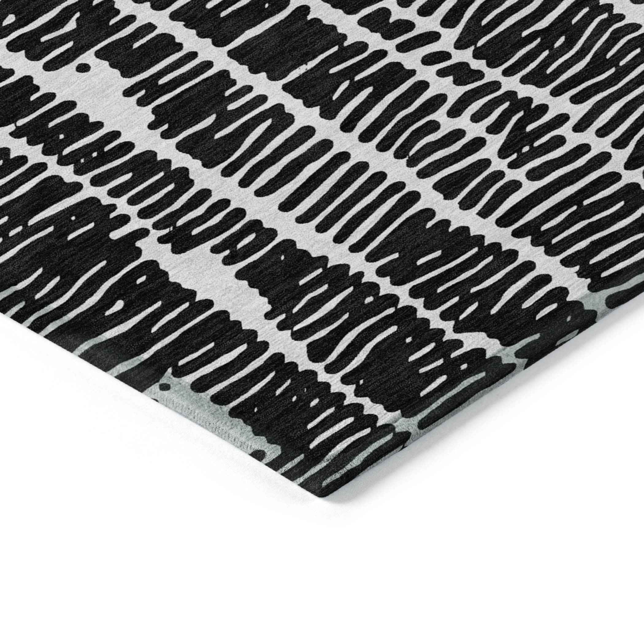 Set an inviting tone in your space with this 8-foot x 10-foot black and ivory abstract washable indoor outdoor area rug. This rectangle shaped rug features a abstract design that will work well both indoors or out. A classic shape marries with good looking design for your living room, hall, bedroom, porch, patio, or poolside. The coloration of this rug infuses an updated and modern vibe into your space. Ideal for outdoor spaces or high traffic areas with kids and pets, this rug is made from heavy duty polyester that is stain resistant to help repel water, dirt, and stains. Makes a great way to dress up your patio, porch, or poolside, but also works well as a durable and easy to maintain option in the kitchen, family room, or mudroom. 96-inch h x 120-inch w x 0.19-inch d.