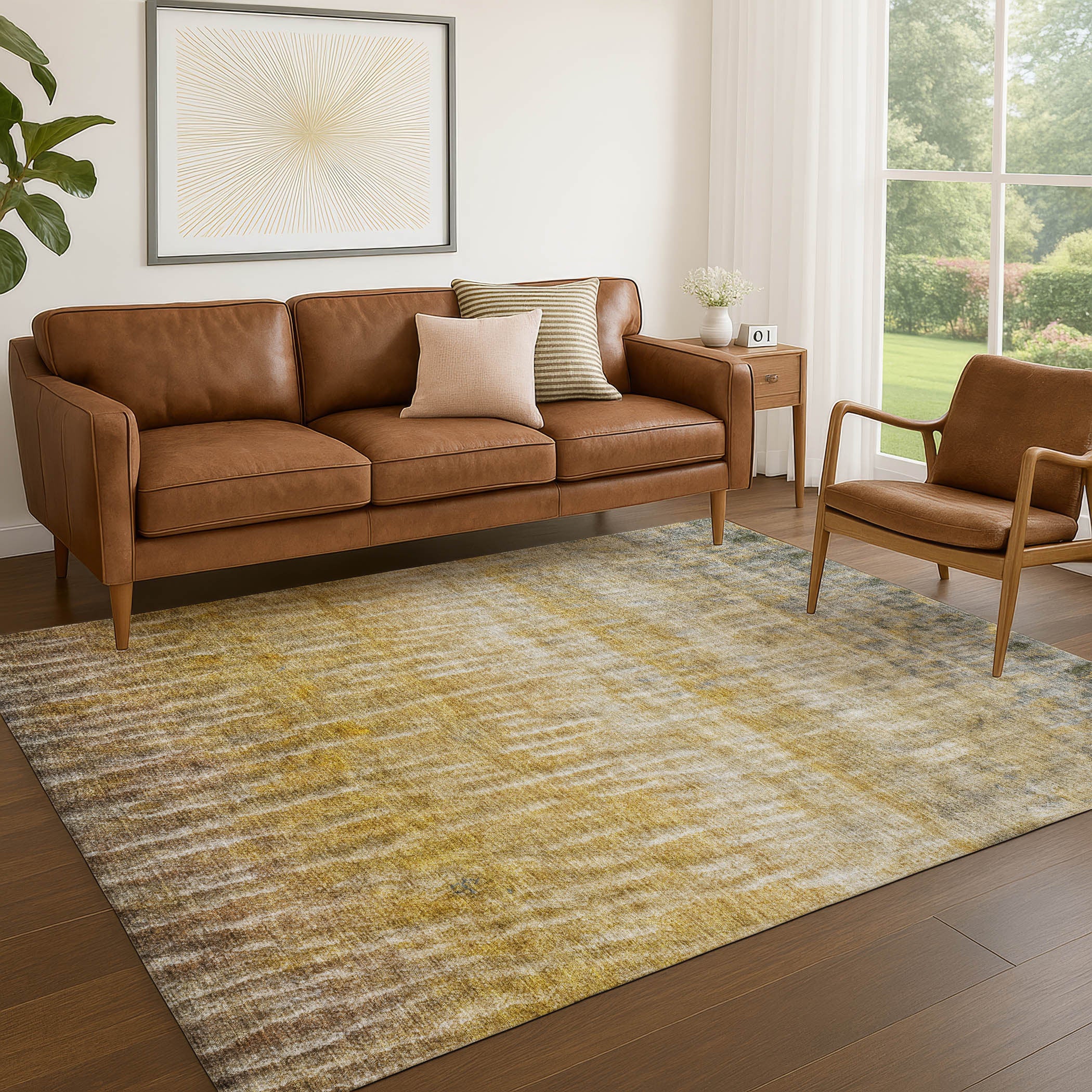 This 8-foot x 10-foot gold beige and gray abstract washable indoor outdoor area rug, is a great way to add warmth to a room. This rectangle shaped rug features a abstract design that will work well both indoors or out. A classic shape marries with good looking design for your living room, hall, bedroom, porch, patio, or poolside. Ideal for outdoor spaces or high traffic areas with kids and pets, this rug is made from heavy duty polyester that is stain resistant to help repel water, dirt, and stains. Makes a great way to dress up your patio, porch, or poolside, but also works well as a durable and easy to maintain option in the kitchen, family room, or mudroom. 96.00-inch h x 120.00-inch w x 0.19-inch d.