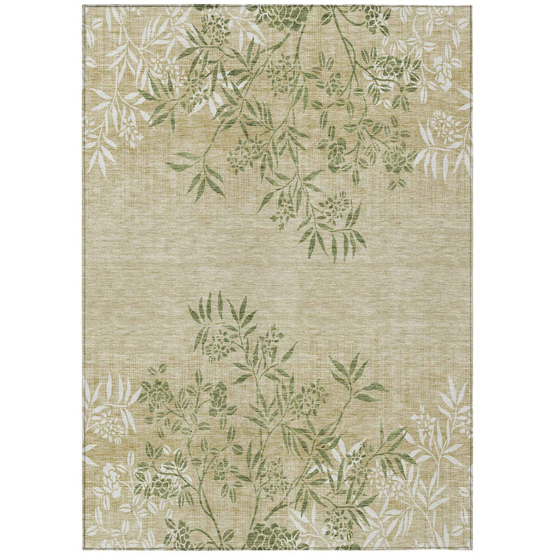 9' X 12' Khaki Ivory And Green Floral Washable Indoor Outdoor Area Rug