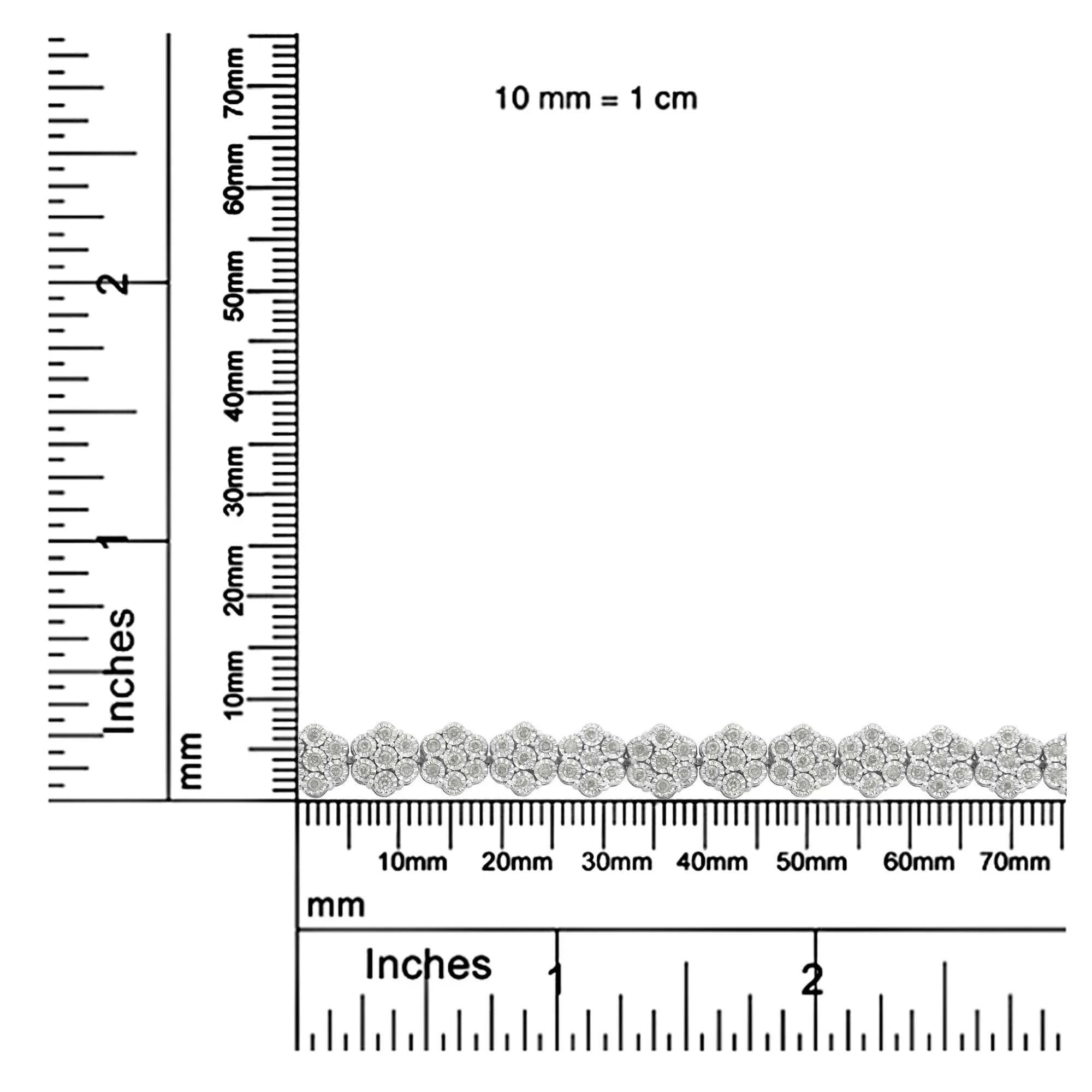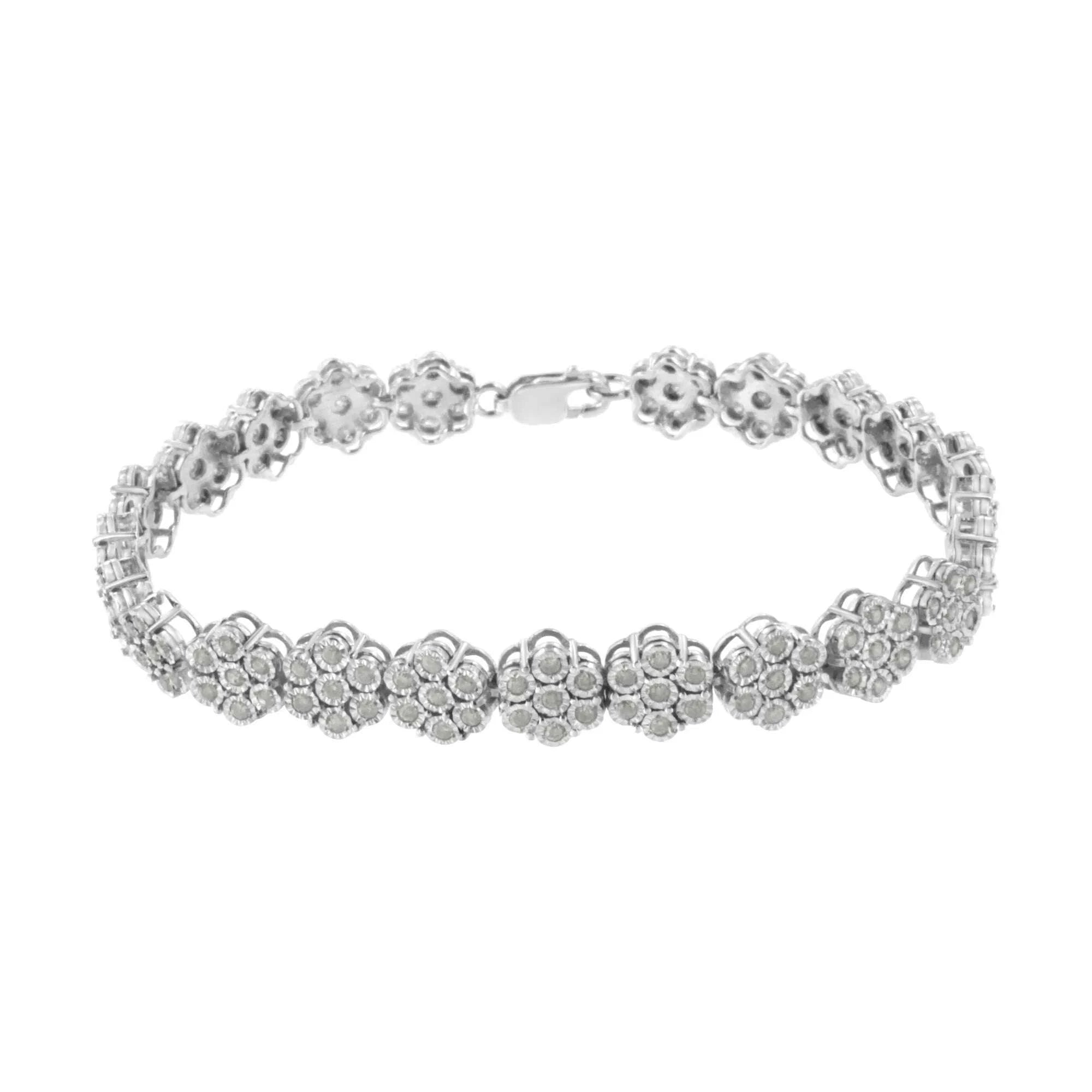 This wonderful flower link bracelet is fashioned in sterling silver and showcases 2 carats TDW in diamonds. One hundred and sixty one promo quality round cut diamonds glisten in this design. Seven miracle set diamonds create each one of the flower links that make up this unique bracelet that secures with a lobster claw clasp. Promo quality diamonds are on the lowest of diamond color and quality scale. Round-cut, promo quality diamonds are milky and cloudy in nature. They have asymmetrical ball shape and are filled with inclusions.