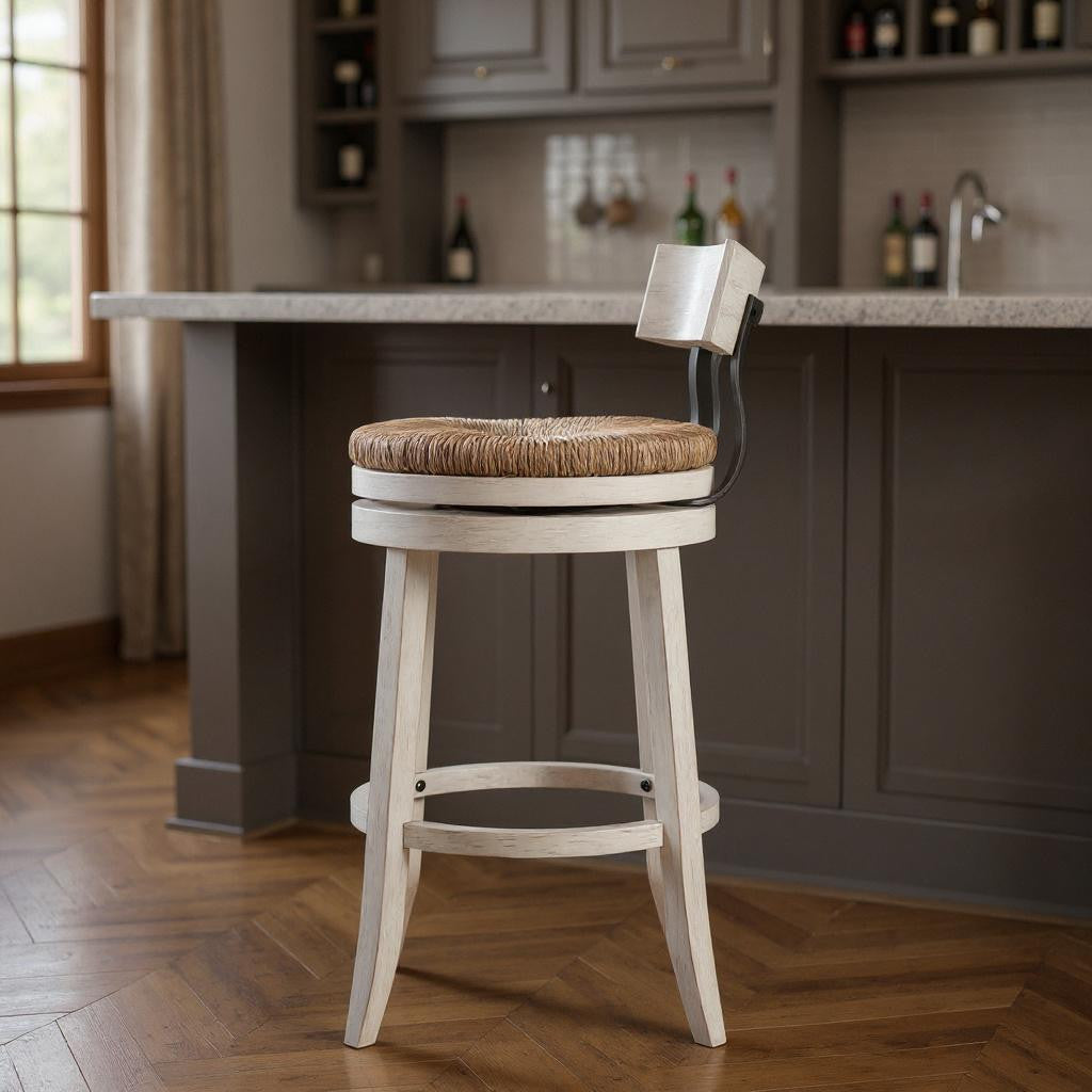 Brown and White Rattan and Solid Wood Low Back Bar Height Swivel Bar Chair