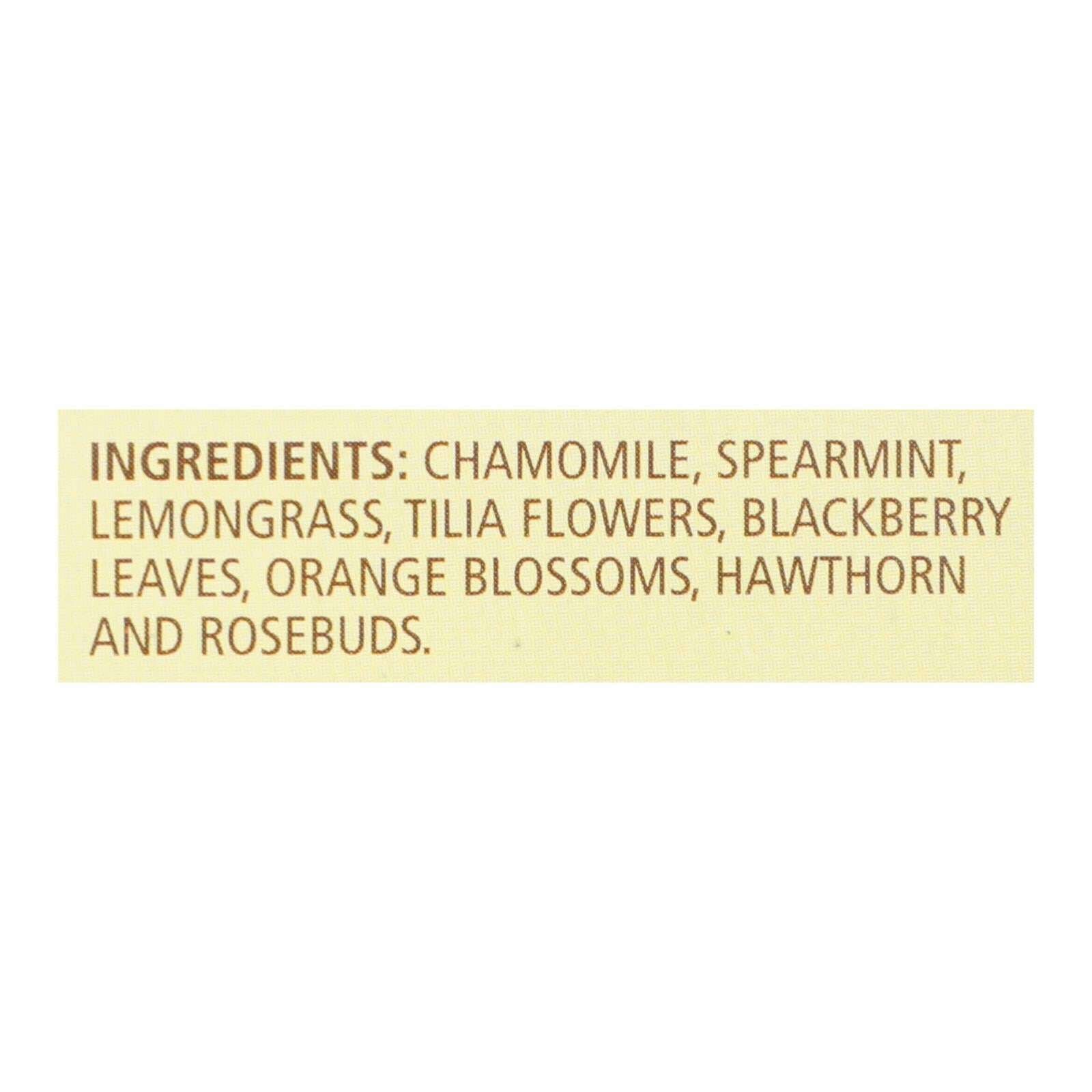 ingredients : chamomile;spearmint;lemongrass;tilia flowers;blackberry leaves;orange blossoms;hawthorn and rosebuds