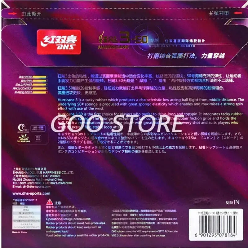 DHS Hurricane 3-50 / SKYLINE 3-60 Pips-In Table Tennis Rubber (Control / Loop) Original DHS Ping Pong Sponge