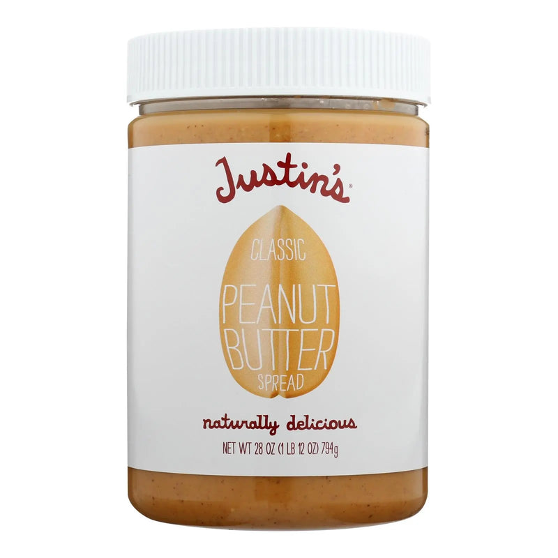 Per serving: 7 g protein (8% daily value); no added sugars (not a low calorie food). Certified gluten-free. Non gmo project verified. Nongmoproject.org. Naturally delicious. I'm not shouting. This is just how i talk when i'm on the side of this really big jar of my classic peanut butter spread. It's more than ever before! more tasty peanuts!. More one-of-a-kind grind! more scooping! more spreading! more deliciousness! more, more, more! wait, maybe i am shouting a little bit. I'm just really excited. Sorry. - justin. Justins.com. Orangutan friendly palm oil.