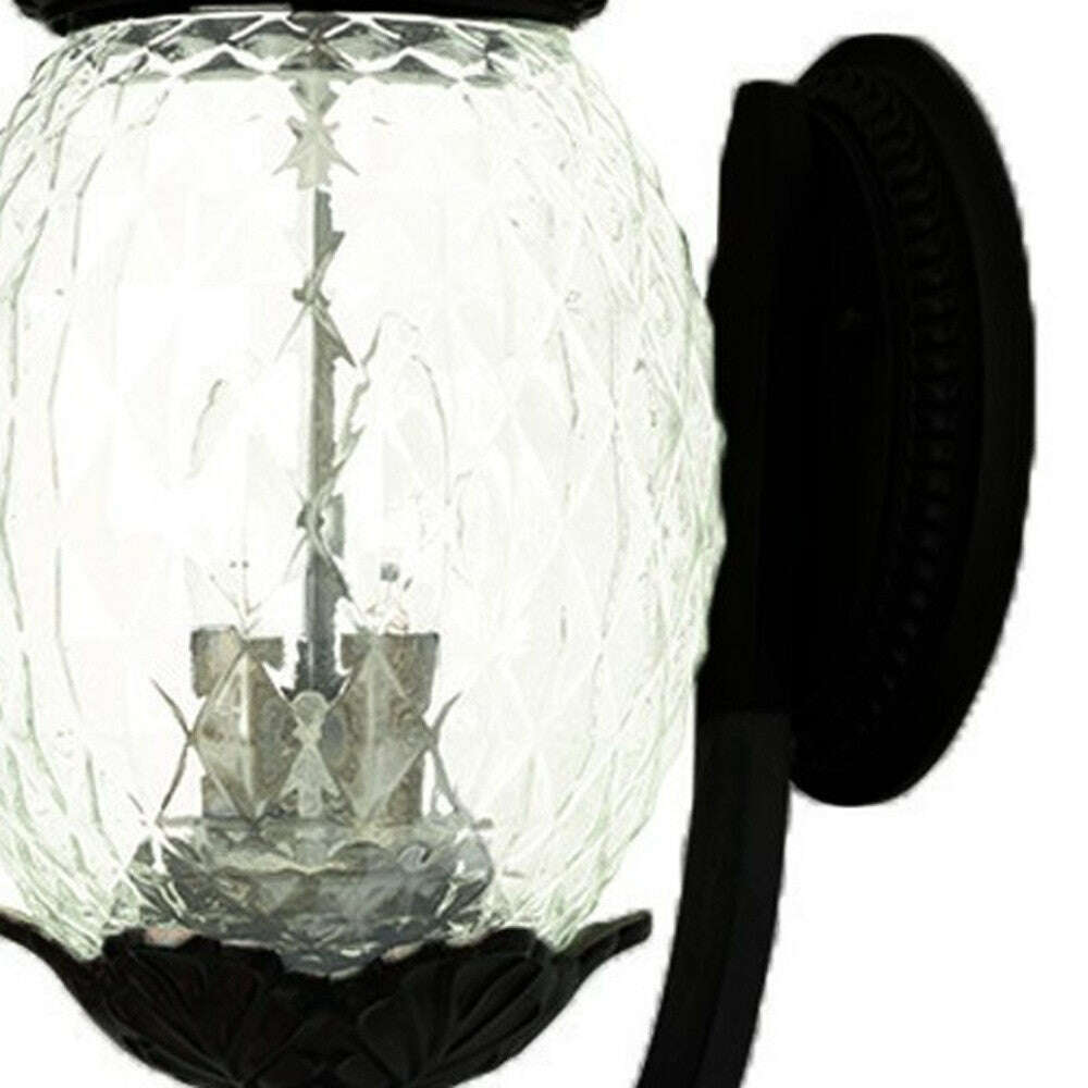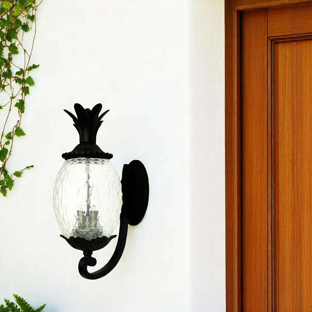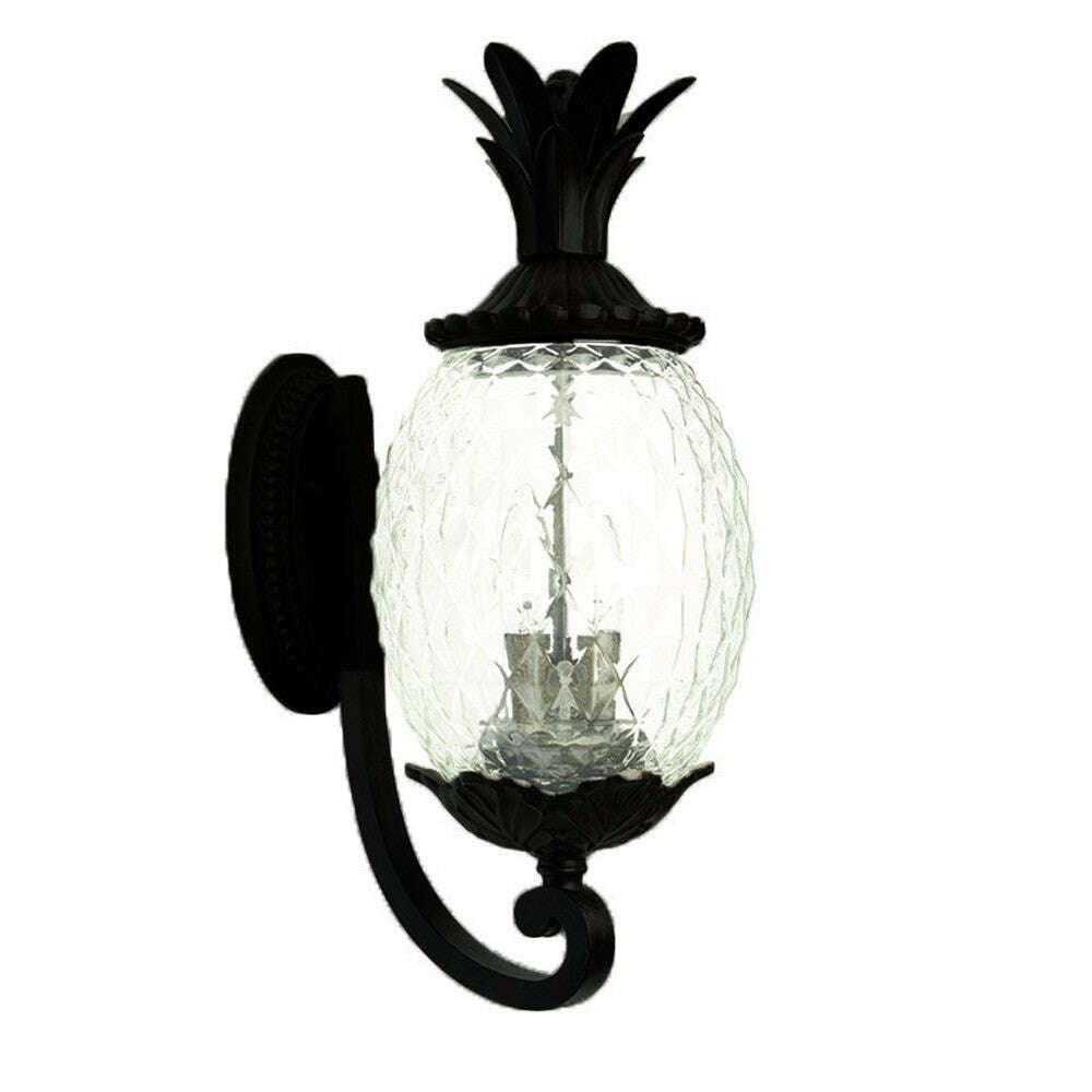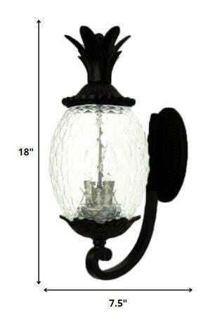With this Matte Black Pineapple Wall Light you can add a touch of whimsical design to any outdoor space. The wall bracket has an oval shape and detailing around the edges. Attached to the matte black wall bracket there is a curved rod which is attached to the bottom of the light. The top of the light has leaf details similar to the top of a pineapple. The leaves flow into a sloping roof. The bottom of the light has a curved detailing which ends in a narrow ornament. The glass globe has a chevron pattern on it and a clear look similar to a real pineapple. Use this light on its own as a statement piece or in pairs. 18" H x 7.5" W x 10" D