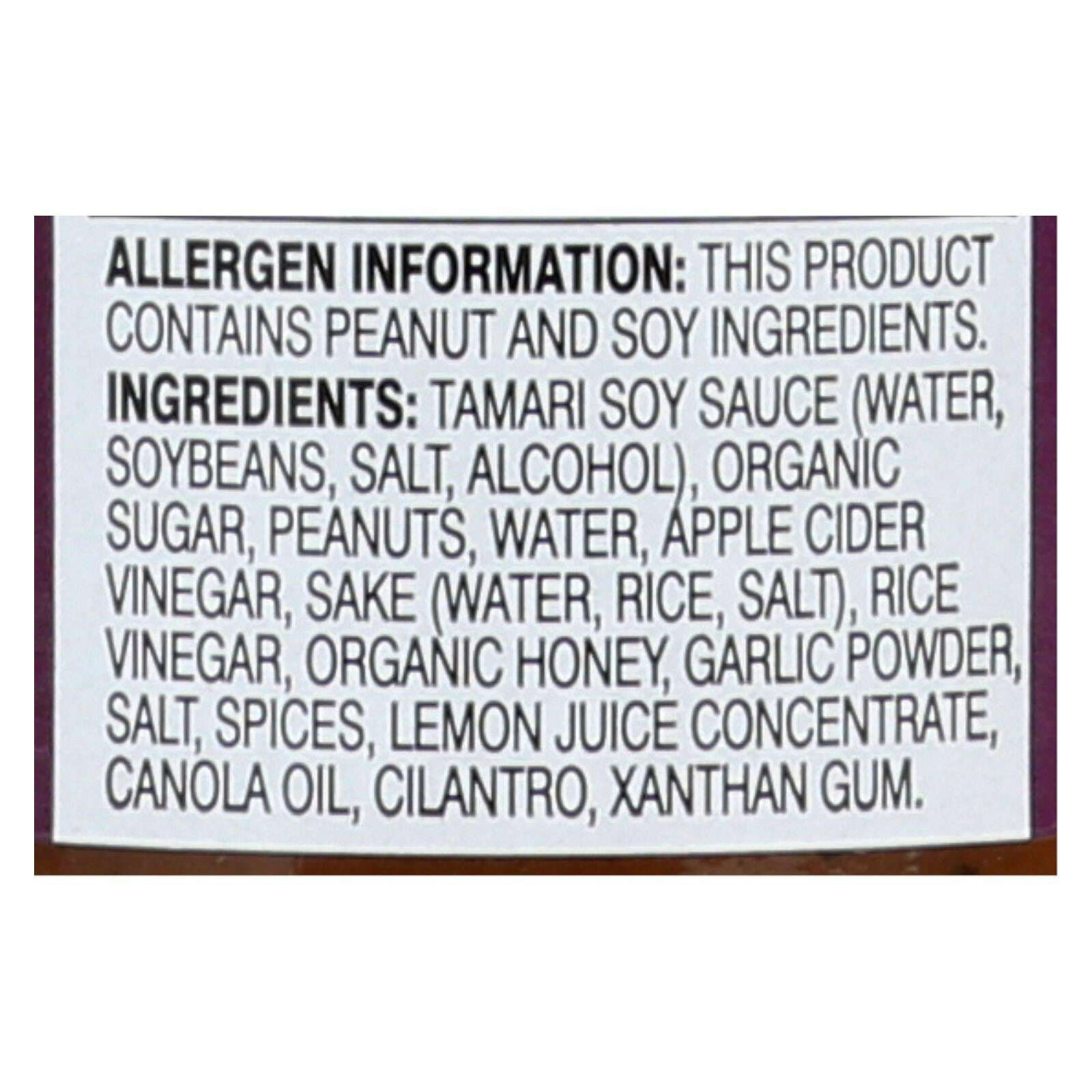 ingredients : tamari soy sauce (water, soybeans, salt, alcohol);organic sugar;peanuts;water;apple cider vinegar;sake (water, rice, salt);rice vinegar;organic honey;garlic powder;salt;spices;lemon juice concentrate;canola oil;cilantro;xanthan gum