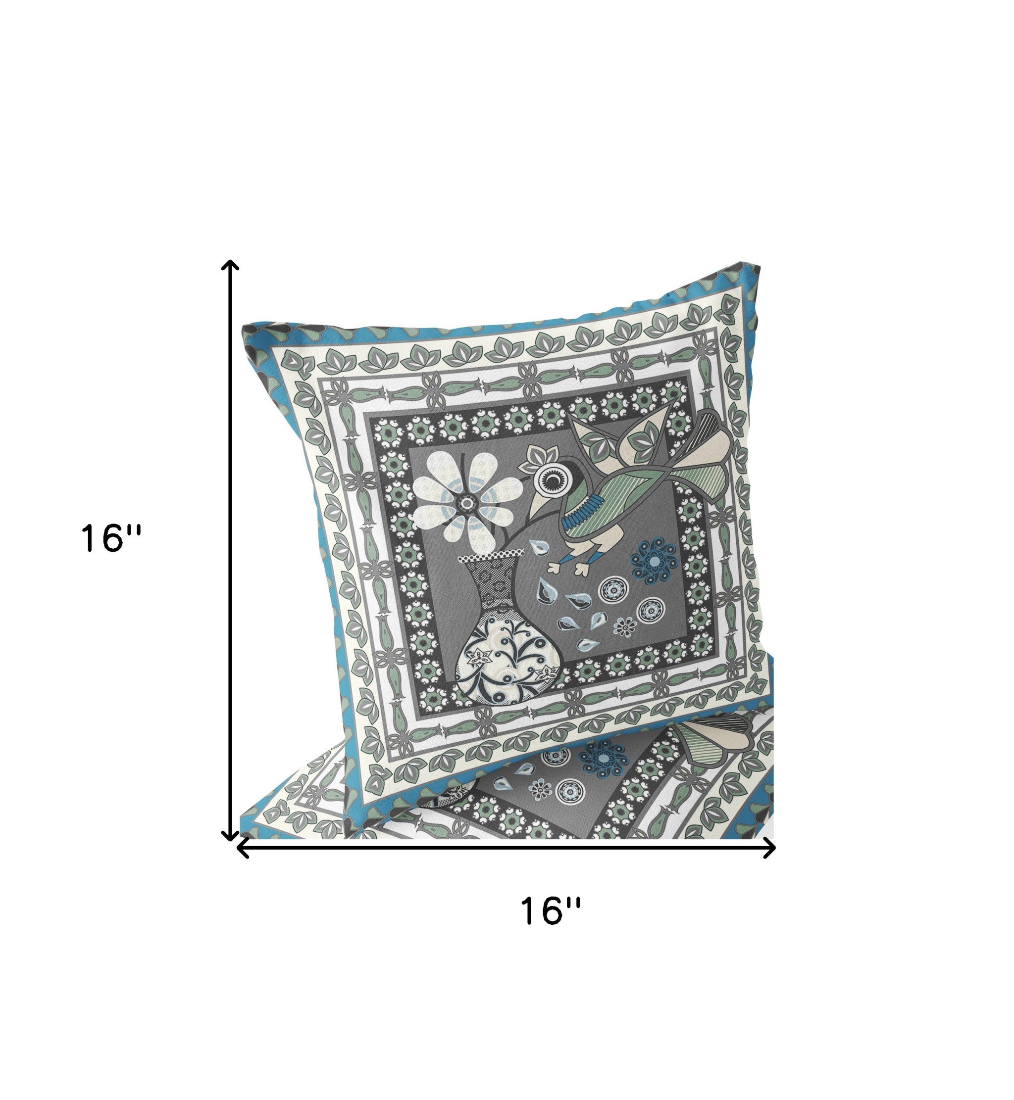 Set of Two 16" X 16" Black Gray and White Peacock Blown Seam Floral Indoor Outdoor Throw Pillow