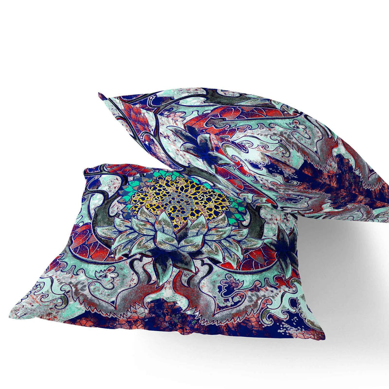 Set of Two 16" X 16" Blue and Green Blown Seam Floral Indoor Outdoor Throw Pillow