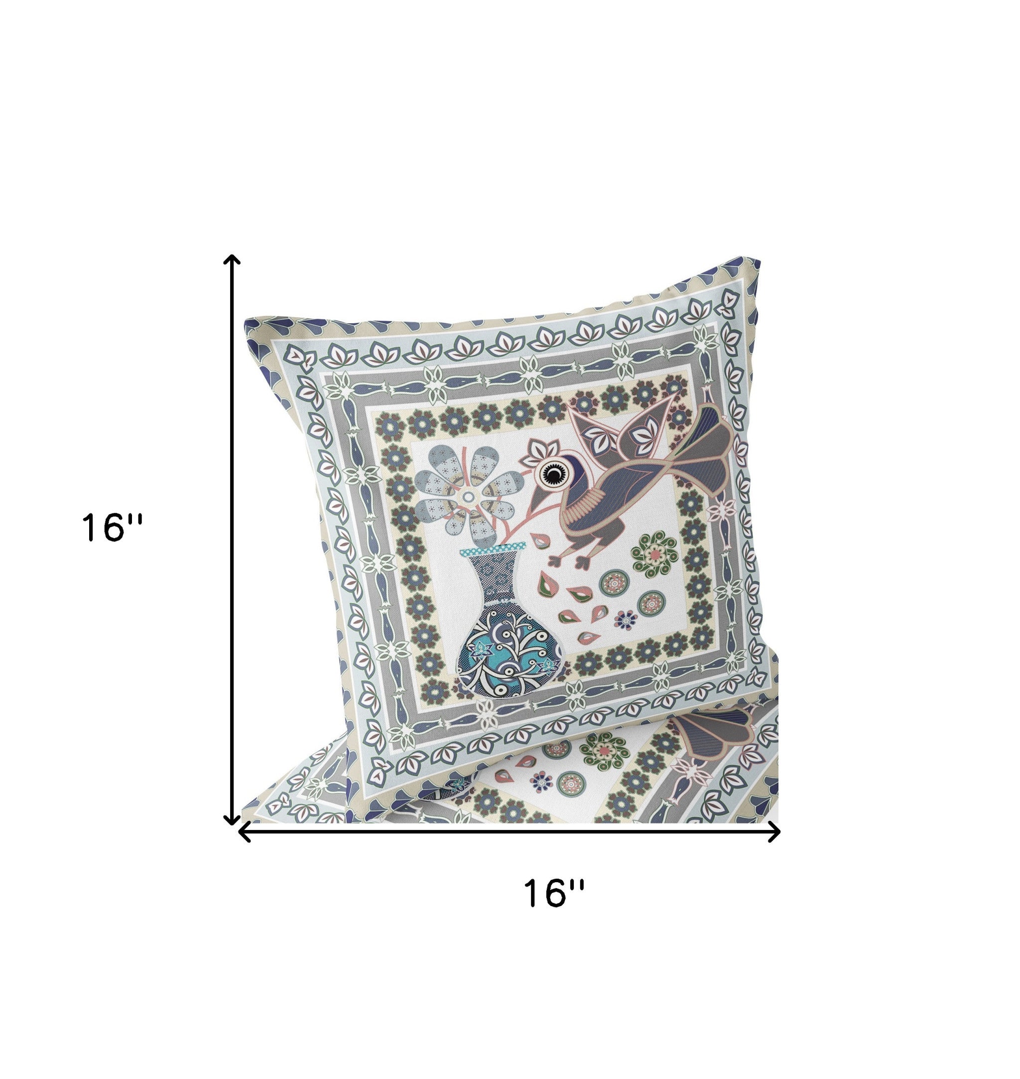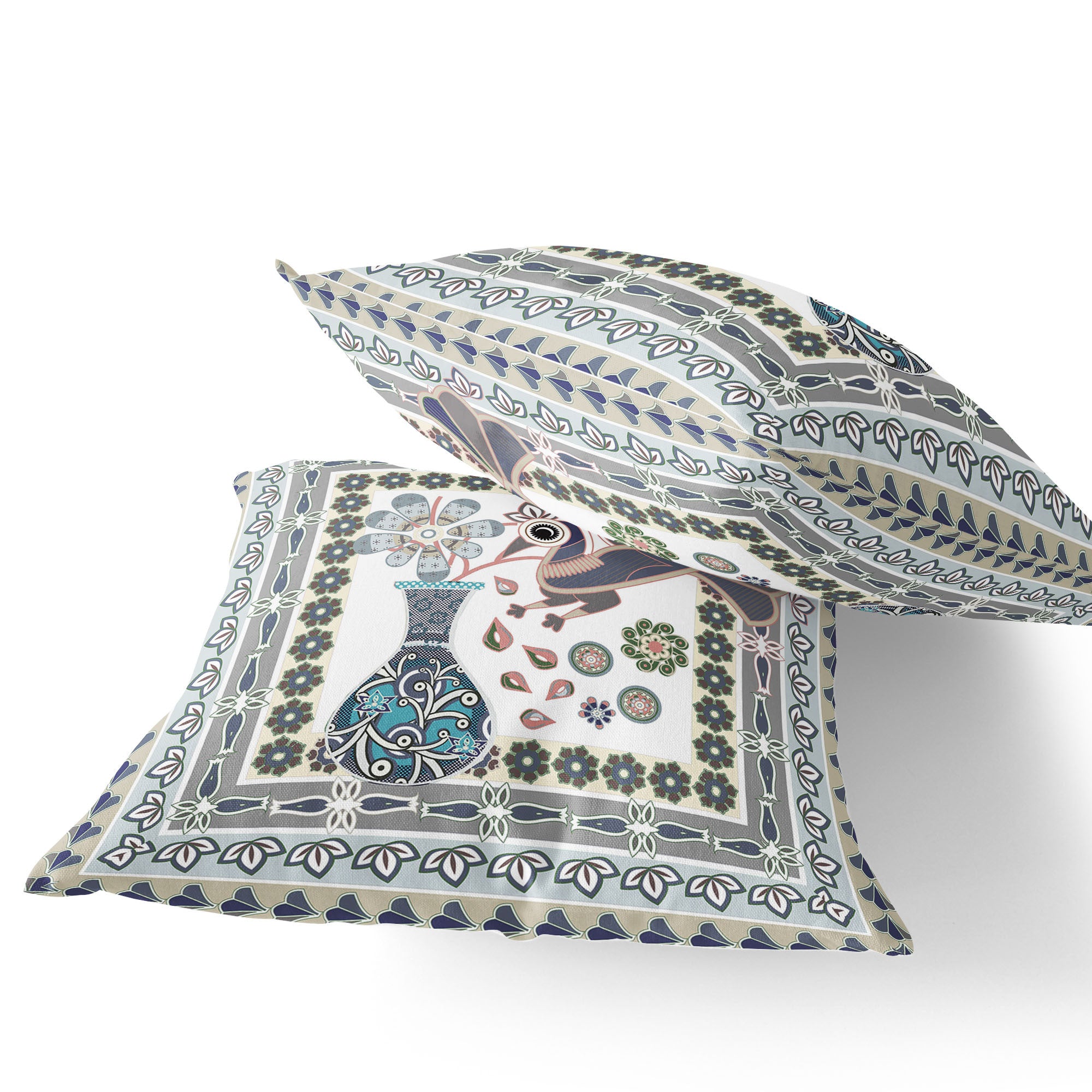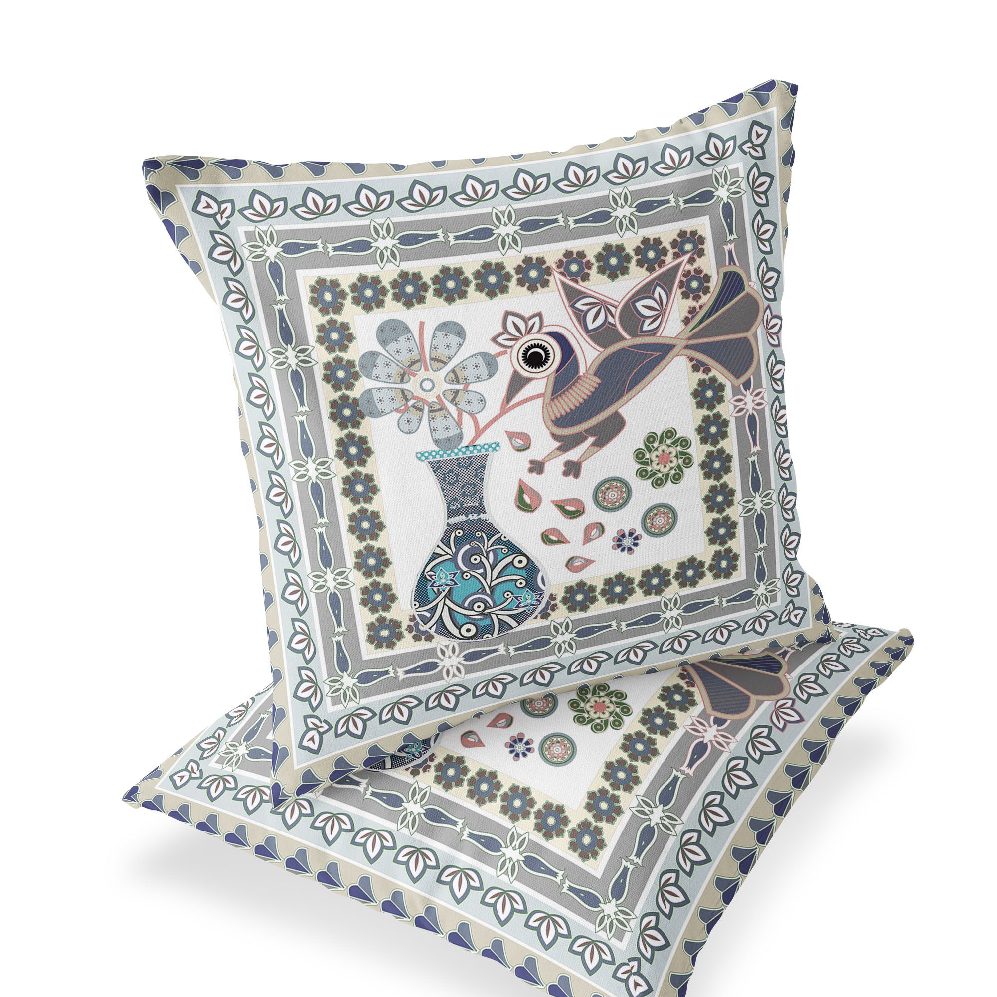 Set of Two 16" X 16" Gray and White Peacock Blown Seam Floral Indoor Outdoor Throw Pillow