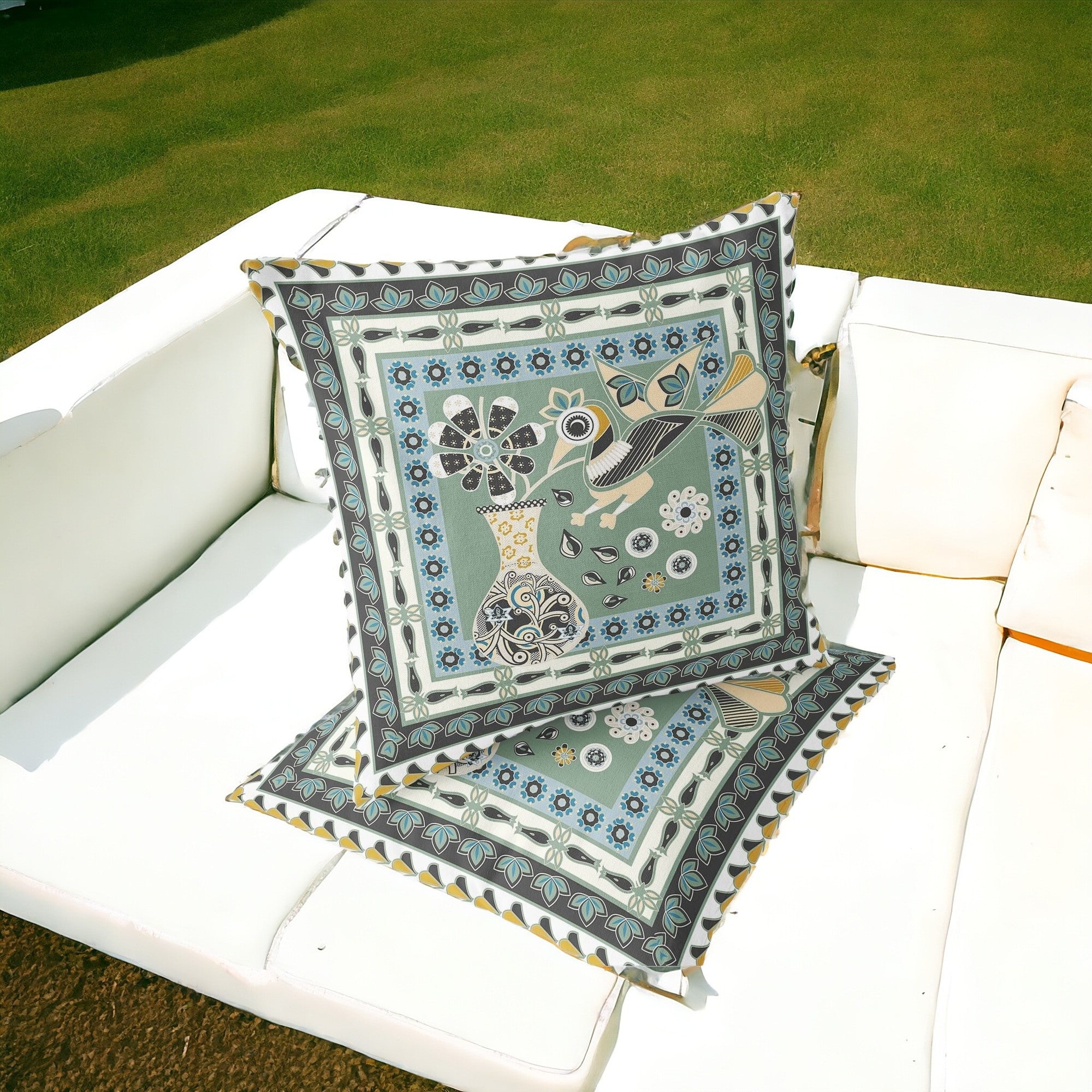 Set of Two 16" X 16" Green and Black Peacock Blown Seam Floral Indoor Outdoor Throw Pillow