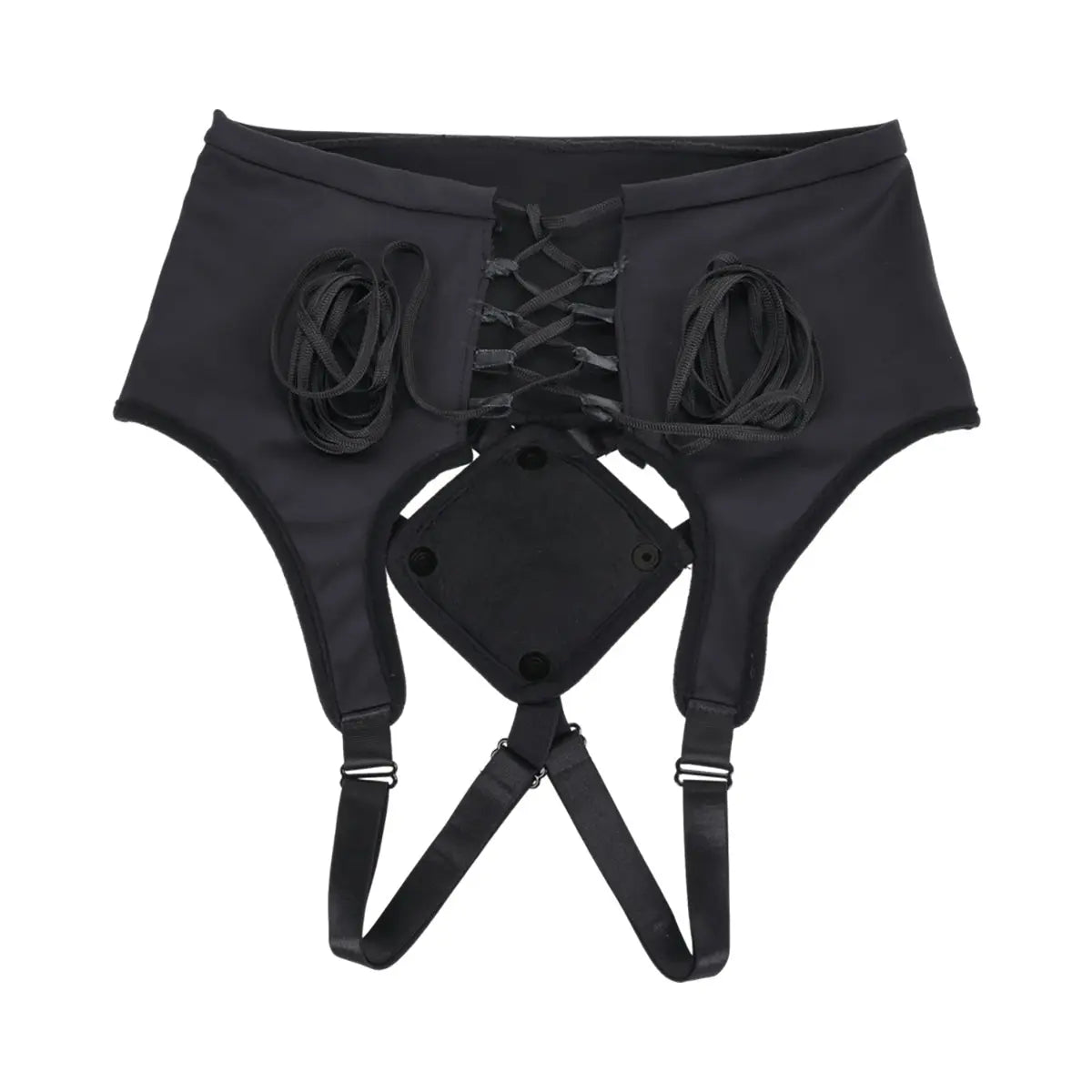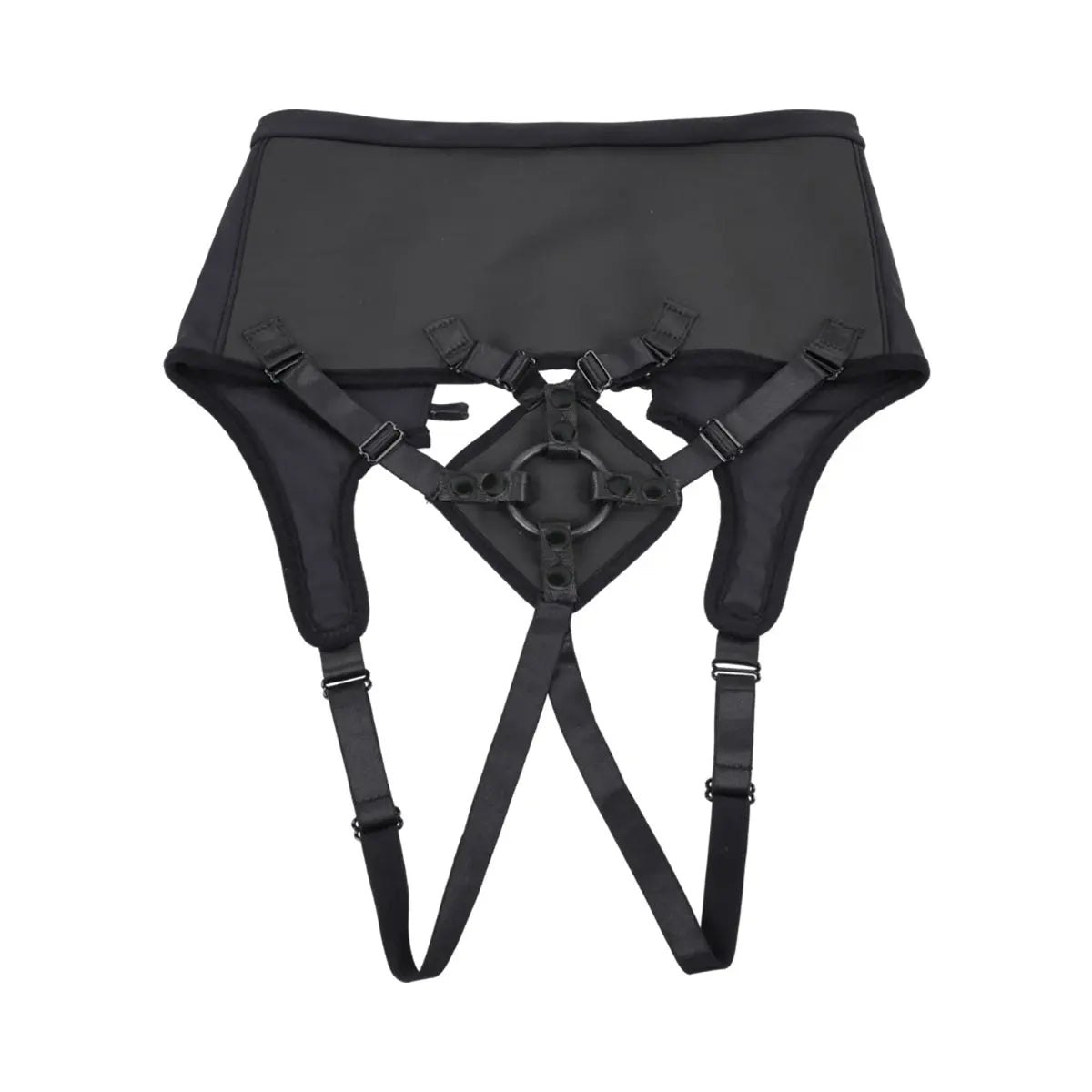 - Six adjustable elastic bands connect front padding for precise dildo placement