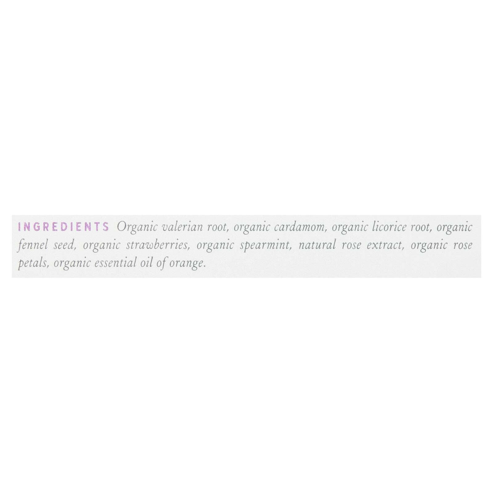 ingredients : organic valerian root;organic cardamom;organic licorice root;organic fennel seed;organic strawberries;organic spearmint;natural rose extract;organic rose petals;organic essential oil of orange