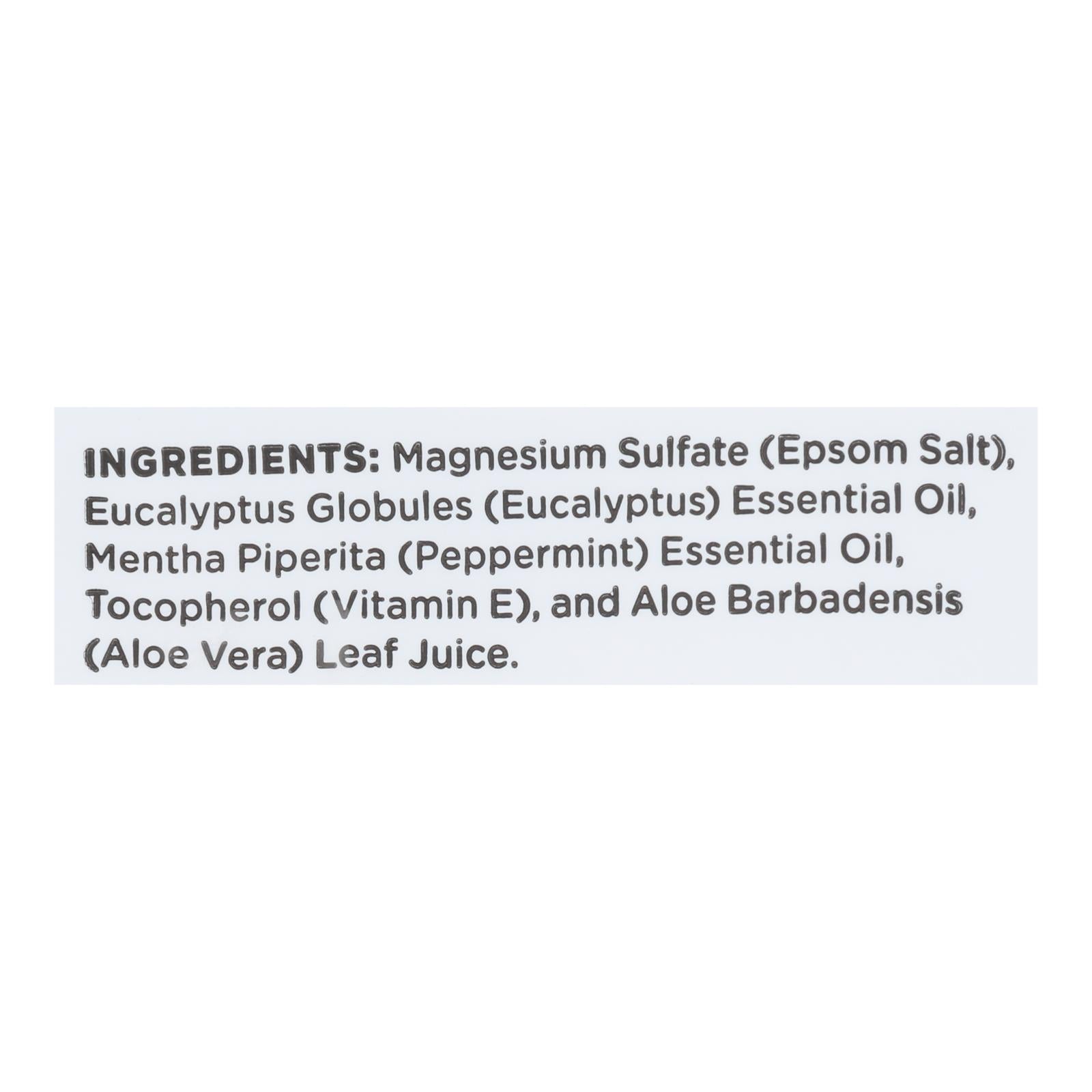 ingredients : magnesium sulfate (epsom salt), eucalyptus globules (eucalyptus) essential oil, mentha piperita (peppermint) essential oil, tocopherol (vitamin e), and aloe barbadensis (aloe vera) leaf juice.