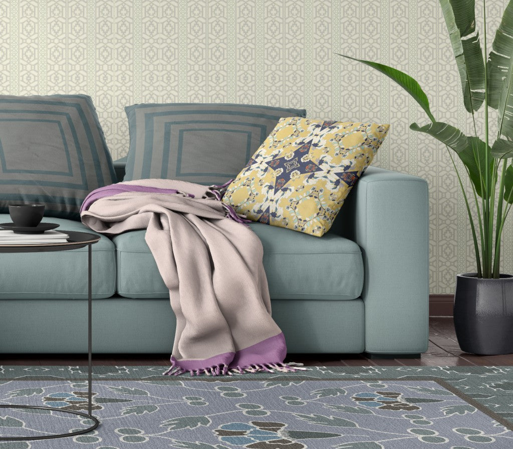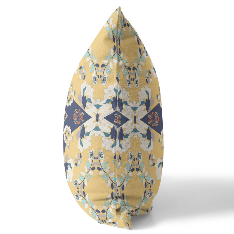 16" X 16" Yellow And Blue Floral Blown Seam Suede Throw Pillow