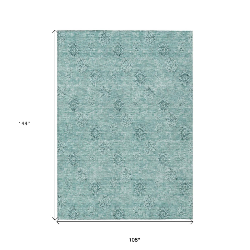 9' X 12' Teal Blue And Ivory Floral Washable Indoor Outdoor Area Rug