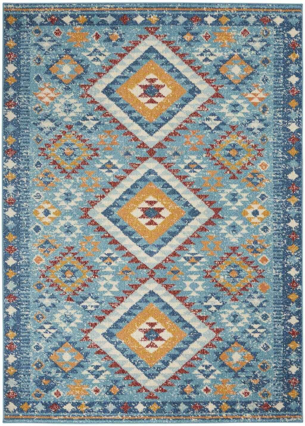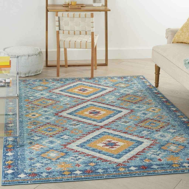 Add some artistry to your room with this 4' x 6' blue and orange geometric dhurrie area rug. This rectangle shaped rug features a geometric design in blue and orange to give it visual interest. A classic shape marries with good looking design for your space This superior Turkish rug represents the highest quality and is built to last. Place this area rug against a hardwood or tile floor and it will enliven your living space with style and sophistication. 1" H x 45" W x 69" D