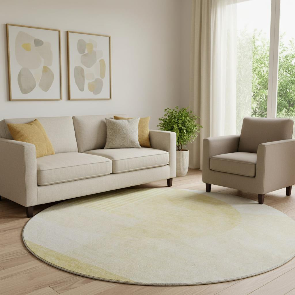 This 8-foot gold and ivory geometric washable round rug with uv protection, is a great way to add warmth to a room. Ideal for spaces with kids and pets, this rug is stain resistant to help repel dirt and spilled liquids. Built to last, this rug crafted from polyester fibers is known for its durability and long lasting appeal. Rugs are a great way to showcase your style, hide imperfections, warm your home and reduce noise. This larger sized, transitional styled rug is ready to create a focal point or statement piece in your room. 96.00-inch h x 96.00-inch w x 0.39-inch d.