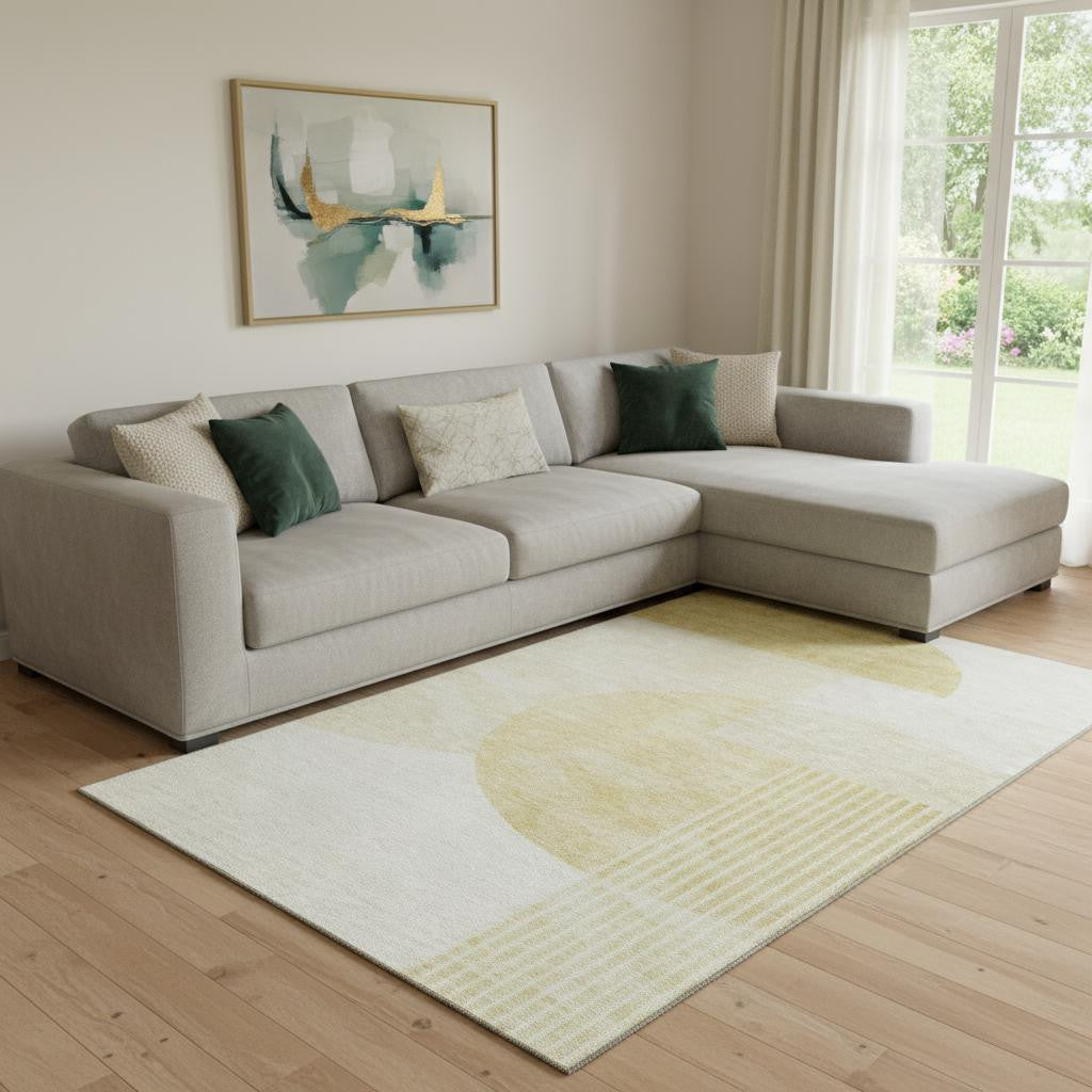 Add great coloration and comfortable texture to your space with this 8-foot x 10-foot gold and ivory geometric washable area rug with uv protection. Ideal for spaces with kids and pets, this rug is stain resistant to help repel dirt and spilled liquids. Built to last, this rug crafted from polyester fibers is known for its durability and long lasting appeal. Rugs are a great way to showcase your style, hide imperfections, warm your home and reduce noise. This larger sized, transitional styled rug is ready to create a focal point or statement piece in your room. 96.00-inch h x 120.00-inch w x 0.39-inch d.