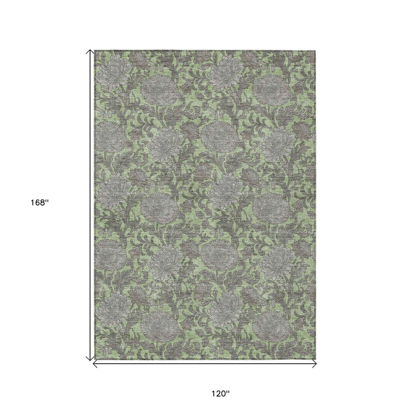 10' X 14' Artichoke Green Gray And Taupe Floral Washable Indoor Outdoor Area Rug