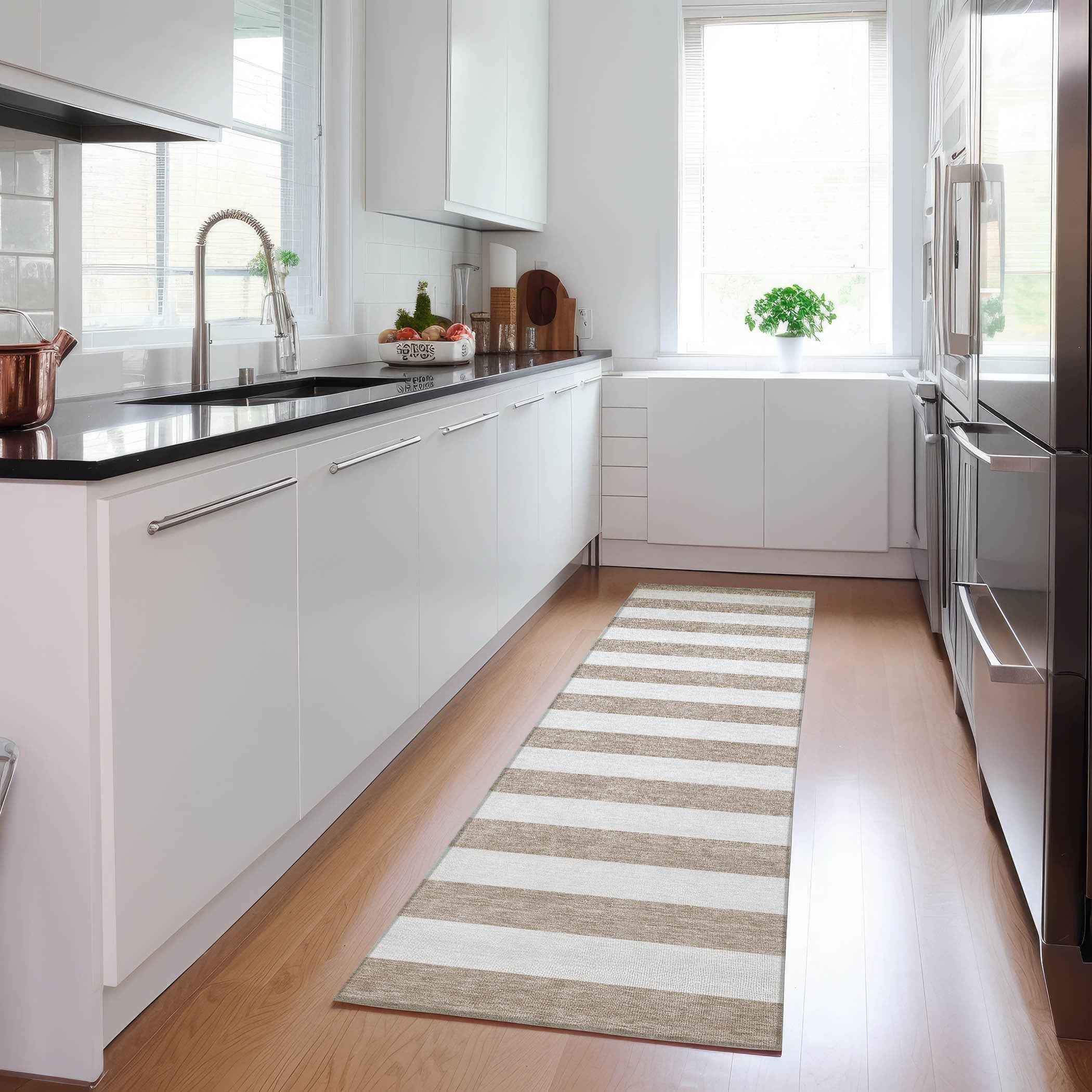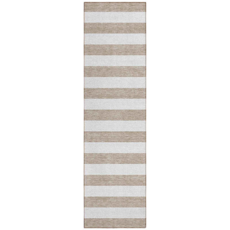 2' X 8' Taupe and White Striped Washable Indoor Outdoor Runner Rug