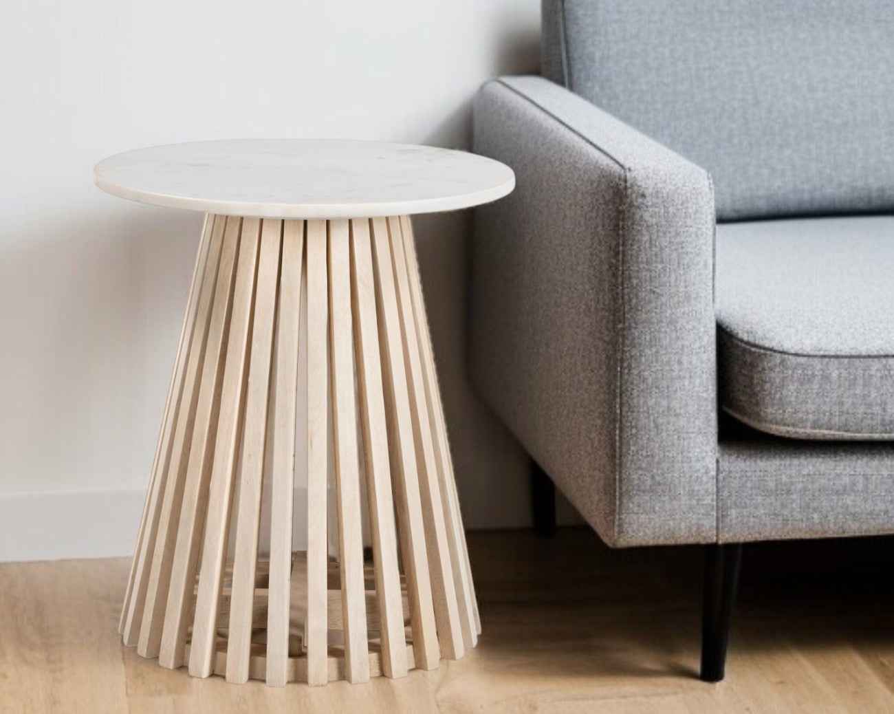 20" White and Natural Distressed Marble and Solid Wood Round Pedestal End Table