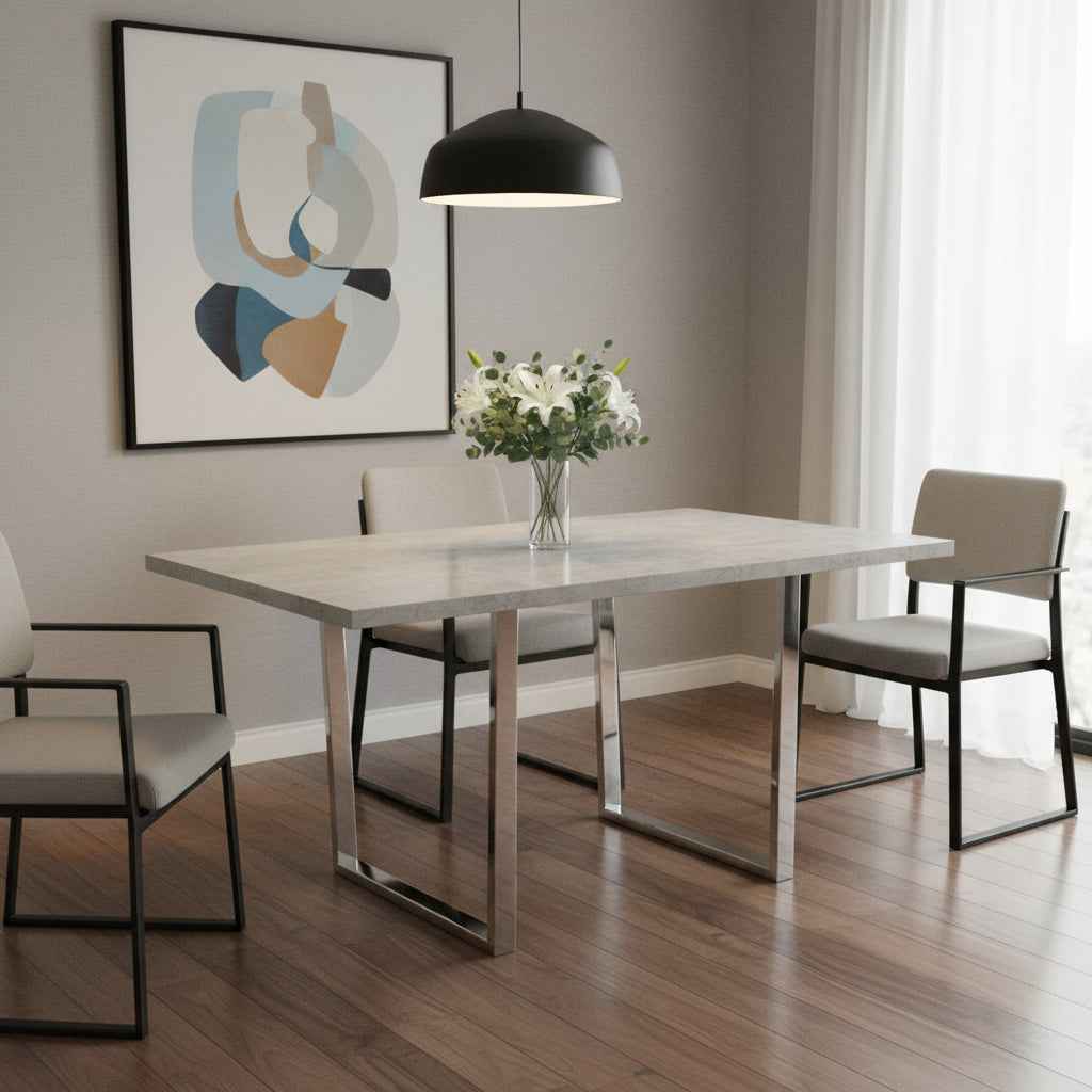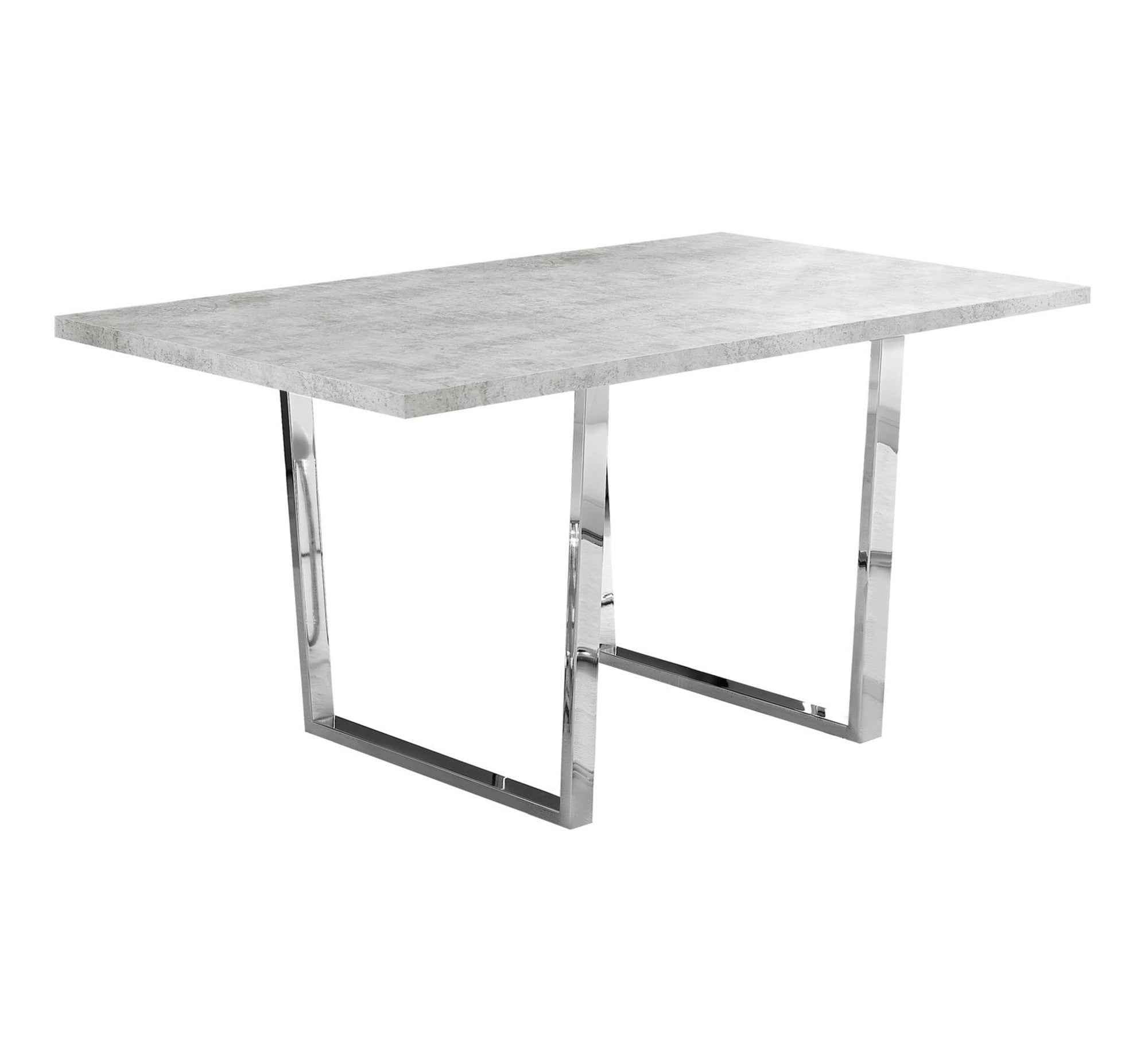 Give your room the perfect anchor piece with this 36-inch gray and silver metal double pedestal base dining table. The silver coloration of the high quality metal base marries nicely with the gray manufactured wood top surface. The two-tone finish gives it a fresh and updated look. A beautiful double pedestal base adds some dimension and elegance to your dining. This dining table seats 4 people comfortably. Complete your kitchen or dining room with this well made and stylish table. The dining table is a symbol for togetherness, special meals, and conversation. This 36-inch gray and silver metal double pedestal base dining table is a must-have for your home. 30.25-inch H x 36-inch W x 59-inch D