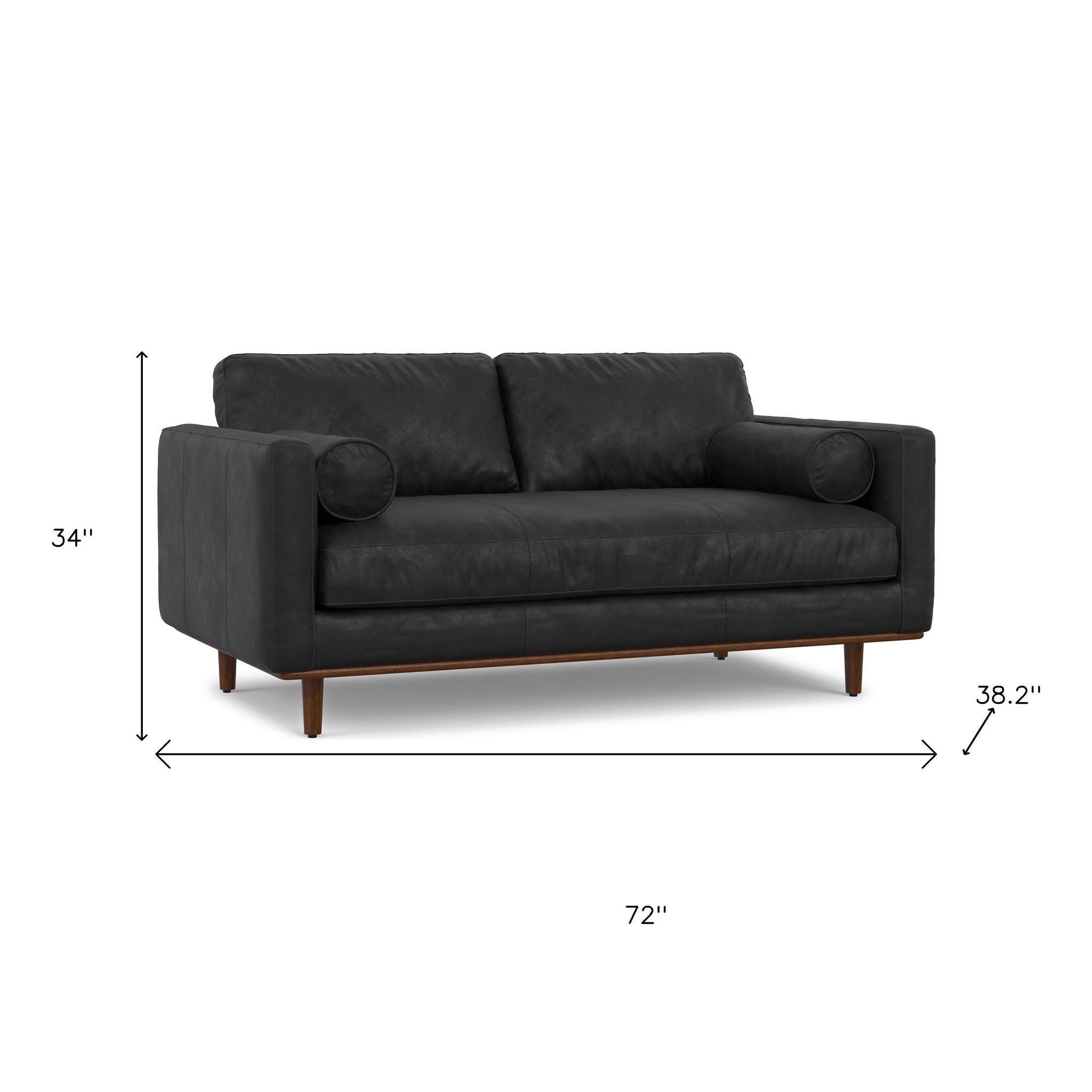 72" Black Leather Sofa With Brown Legs
