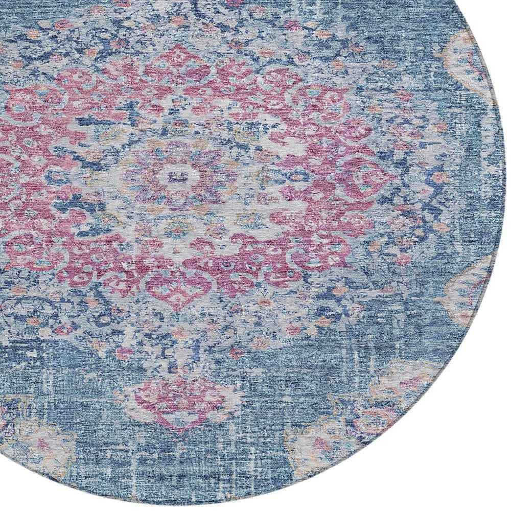 8' Blue Round Floral Medallion Washable Indoor Outdoor Area Rug