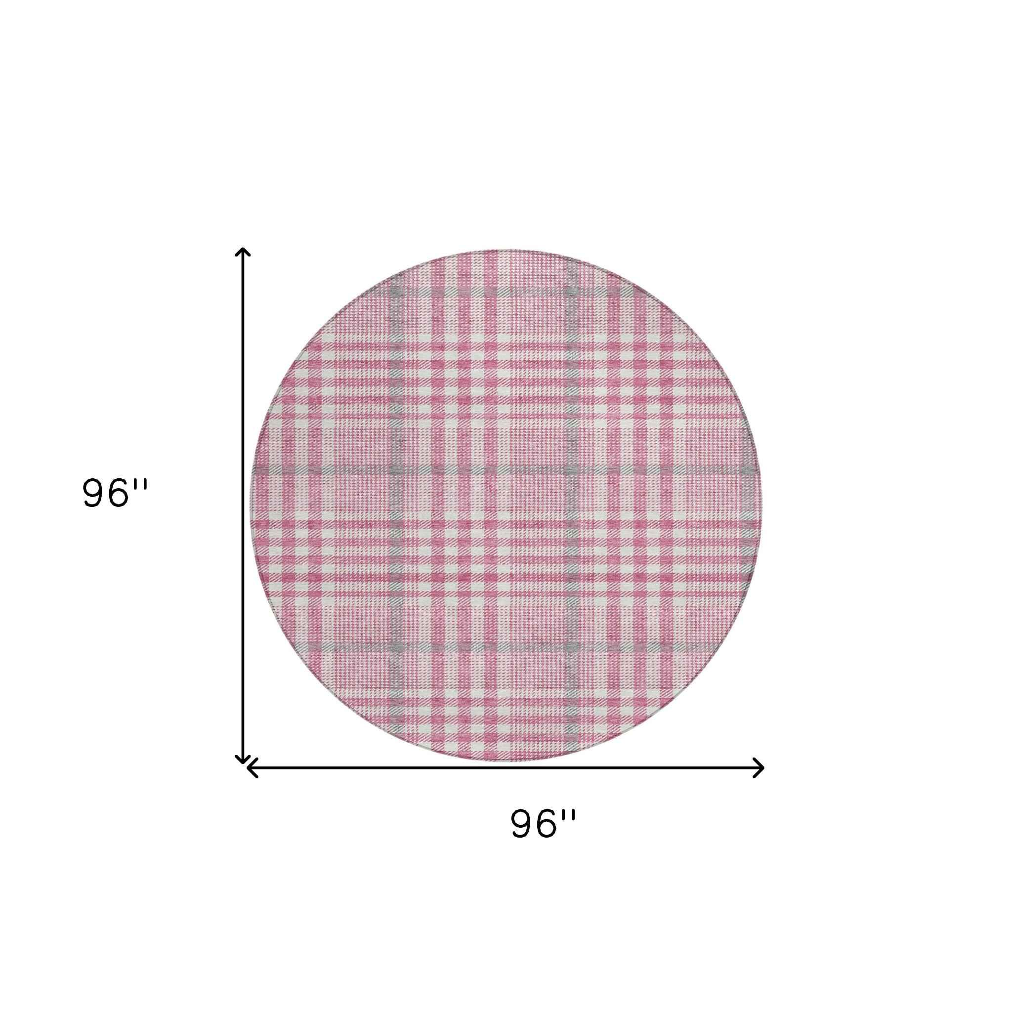8' Blush Gray And Ivory Round Plaid Washable Indoor Outdoor Area Rug