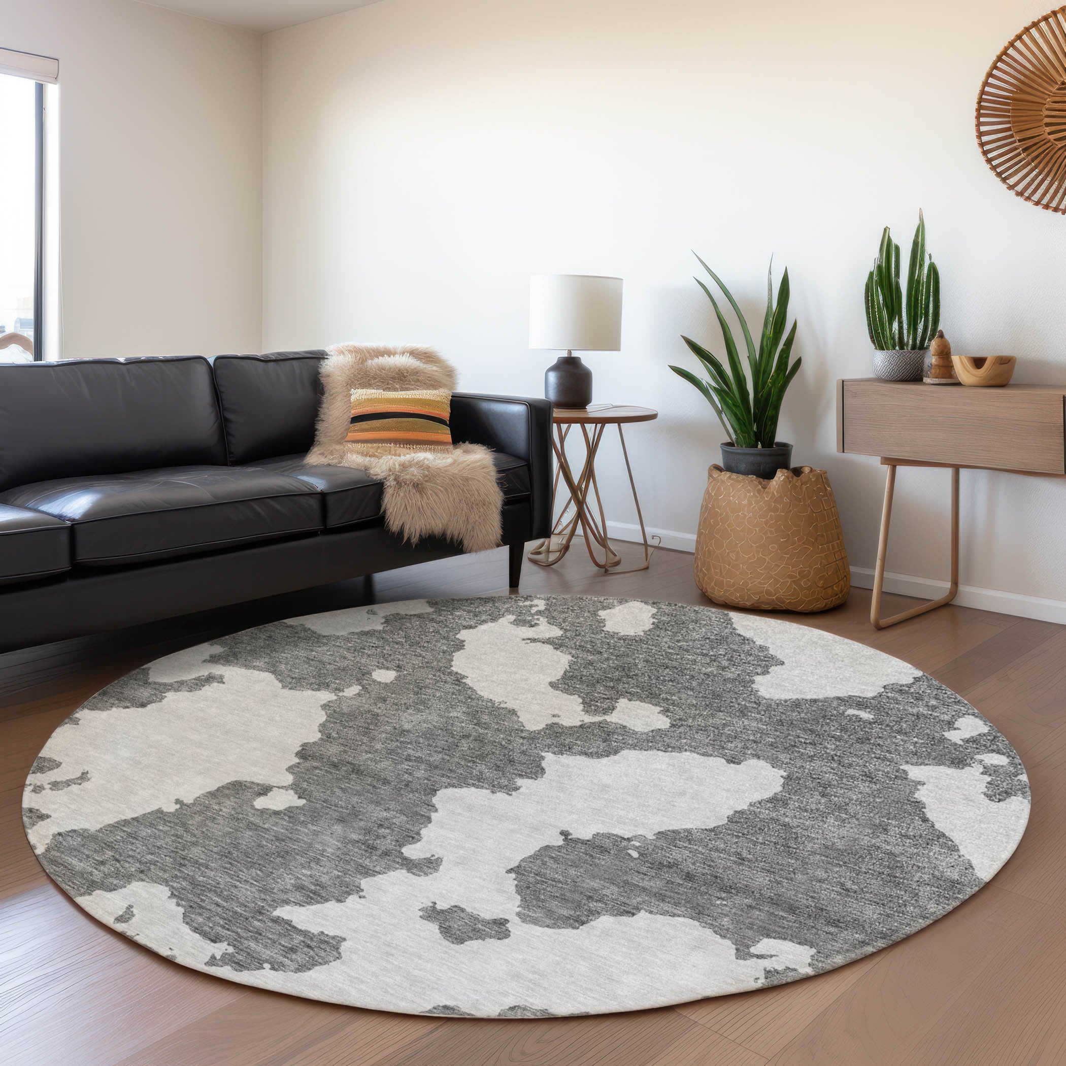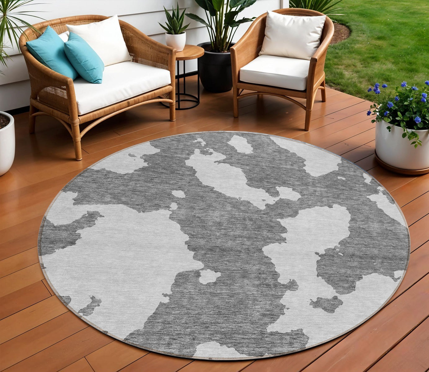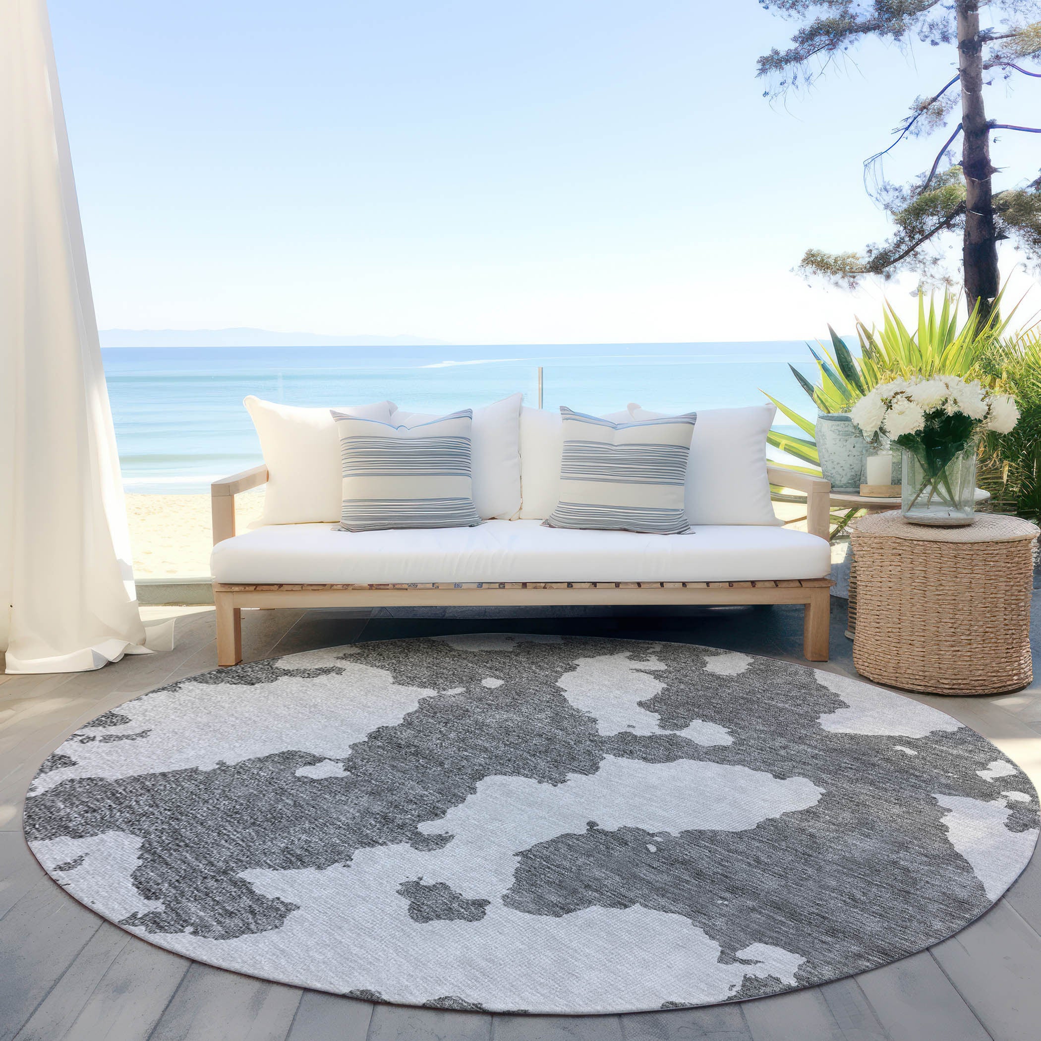 This 8-foot gray and ivory round abstract washable indoor outdoor area rug, is a great way to add warmth to a room. This geometric round shaped rug features a abstract pattern in gray and ivory that combines a good looking print with a unique and updated shape. The mix of shape, color, and design gives this rug refreshing visual interest. Ideal for outdoor spaces or high traffic areas with kids and pets, this rug is made from heavy duty polyester that is stain resistant to help repel water, dirt, and stains. Makes a great way to dress up your patio, porch, or poolside, but also works well as a durable and easy to maintain option in the kitchen, family room, or mudroom. 96-inch h x 96-inch w x 0.19-inch d.
