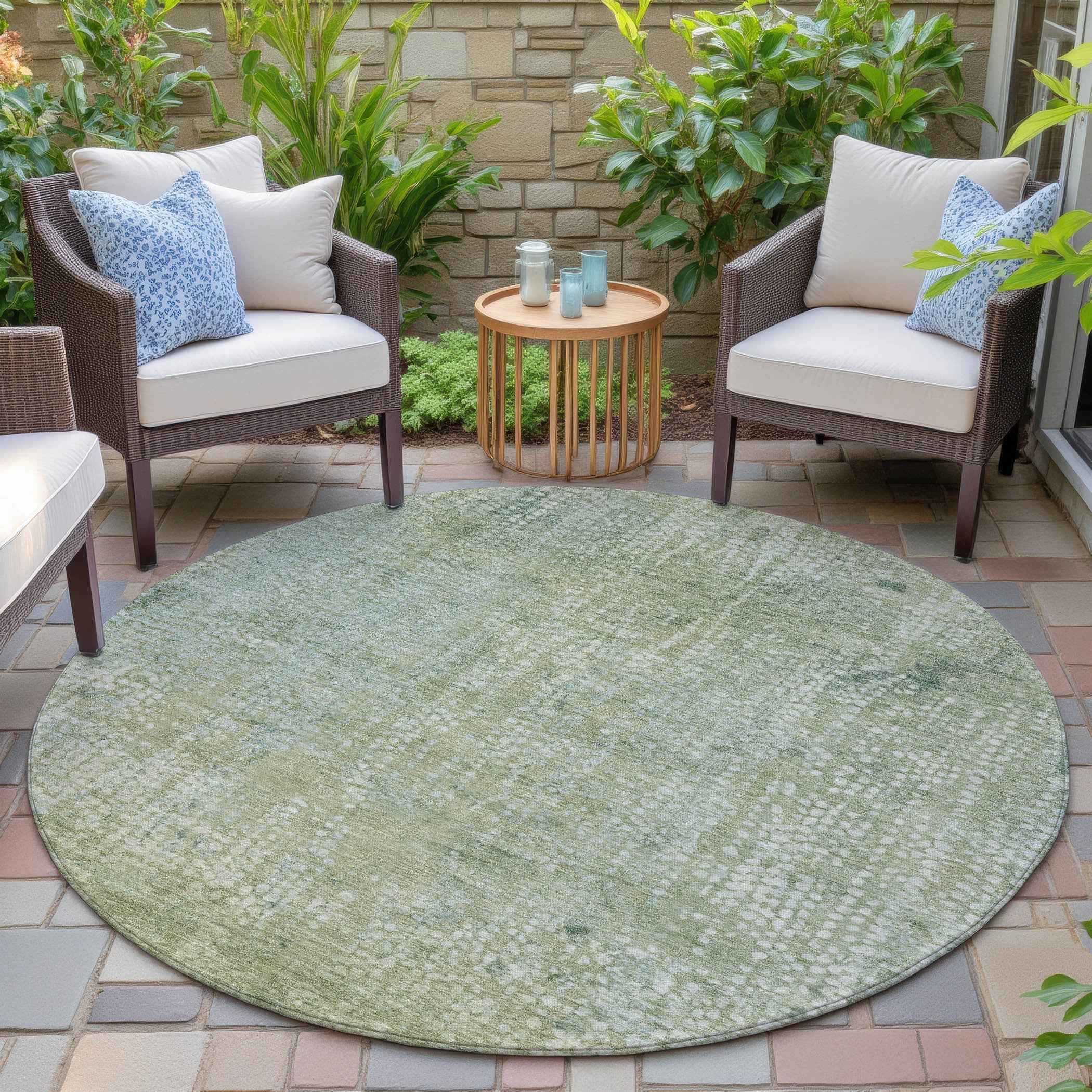 Set an inviting tone in your space with this 8-foot green and ivory round abstract washable indoor outdoor area rug. This geometric round shaped rug features a abstract pattern in green and ivory that combines a good looking print with a unique and updated shape. The mix of shape, color, and design gives this rug refreshing visual interest. Ideal for outdoor spaces or high traffic areas with kids and pets, this rug is made from heavy duty polyester that is stain resistant to help repel water, dirt, and stains. Makes a great way to dress up your patio, porch, or poolside, but also works well as a durable and easy to maintain option in the kitchen, family room, or mudroom. 96-inch h x 96-inch w x 0.19-inch d.